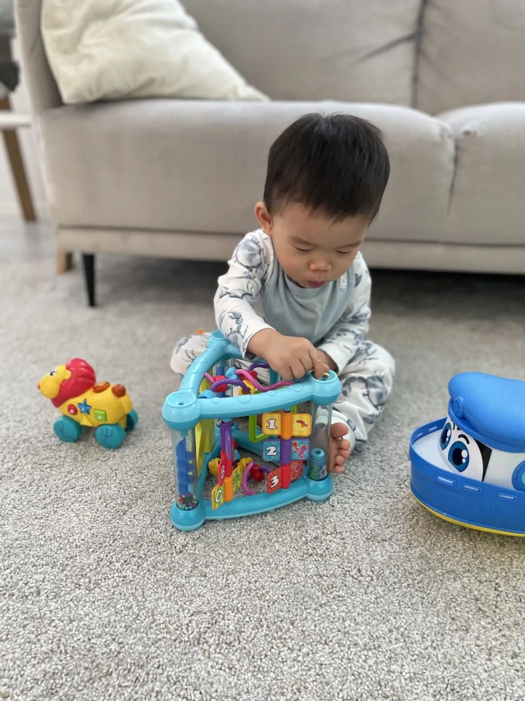 ABC starneste curiozitatea bebelusilor si a copiilor mici cu varsta intre 0-36 de luni cu produse adecvate varstei si sustine dezvoltarea in primii ani de viata.Triunghiul cu activitati poate fi jucat din toate partile si ofera numeroase functii Fata 1 joc de sortare, Fata a 2-a joc de memorie cu cifre, litere si animale de rotit, a 3-a fata oglinda cu un motiv subacvatic dragut pe spate. In interiorul jucariei multifunctionale exista o bucla de abilitati motorii pentru antrenarea abilitatilor motorii ale copiilor. Exista, de asemenea, bile zdranitoare in doua coloane care fac zgomote grozave atunci cand triunghiul este rasturnat. Primele obiective de invatare sunt atinse intr-un mod ludic, se descopera forme si structuri si se antreneaza modele de coordonare.