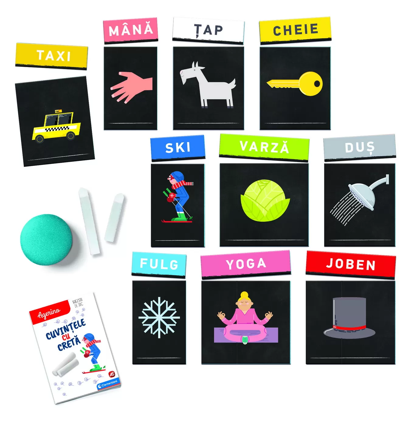 Cuvintele cu creta este un joc din seria Invatarea prin emotie care are drept scop dezvoltarea inteligentei emotionale la copii. Prin joc, copilul poate executa pasii fundamentali utilizati in procesul de scriere, prin antrenarea miscarilor fine ale mainii si practicarea tinerii instrumentului de scris. Utilizarea cretei ofera posibilitatea de a scrie &amp sterge de nenumarate ori! Copiii vor observa atent imaginile de pe 10 tablite, vor gasi cuvintele corespunzatoare si vor scrie cuvintele in spatiile rezervate. Valorile dezvoltate scrisul, citirea, atentia la detalii, inteligenta emotionala, logica, spiritul de observatie. Varsta recomandata 4+.