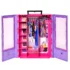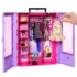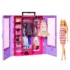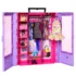 Barbie® Ultimate Closet&trade nu este conceput doar pentru portabilitate, cu un maner de transport, ci include si papusa Barbie®, plus haine si accesorii pentru posibilitati nelimitate de stil! Decorat cu stilul caracteristic al lui Barbie®, dulapul mov cu interior roz are usi transparente, pentru a arunca o privire in garderoba sa. Papusa Barbie® poarta o rochie cu dungi si pantofi si se vine cu haine si accesorii la moda, pe care sa le combinati si sa le asortati. Doua rochii sunt perfecte pentru zi sau noapte, cu imprimeuri moderne si culori populare, impreuna cu doua perechi de pantofi, doua coliere si doua posete. Un raft rabatabil este folosit pentru a agata hainele si este comod pentru schimbarile de stil vestimentar. Include, de asemenea, sase umerase. Dulapul portabil este gata sa calatoreasca oriunde si pentru orice ocazie. Papusa nu isi poate mentine pozitia fara sprijin. Culorile si decoratiunile pot varia. Pentru varste cuprinse intre 3 si 8 ani.