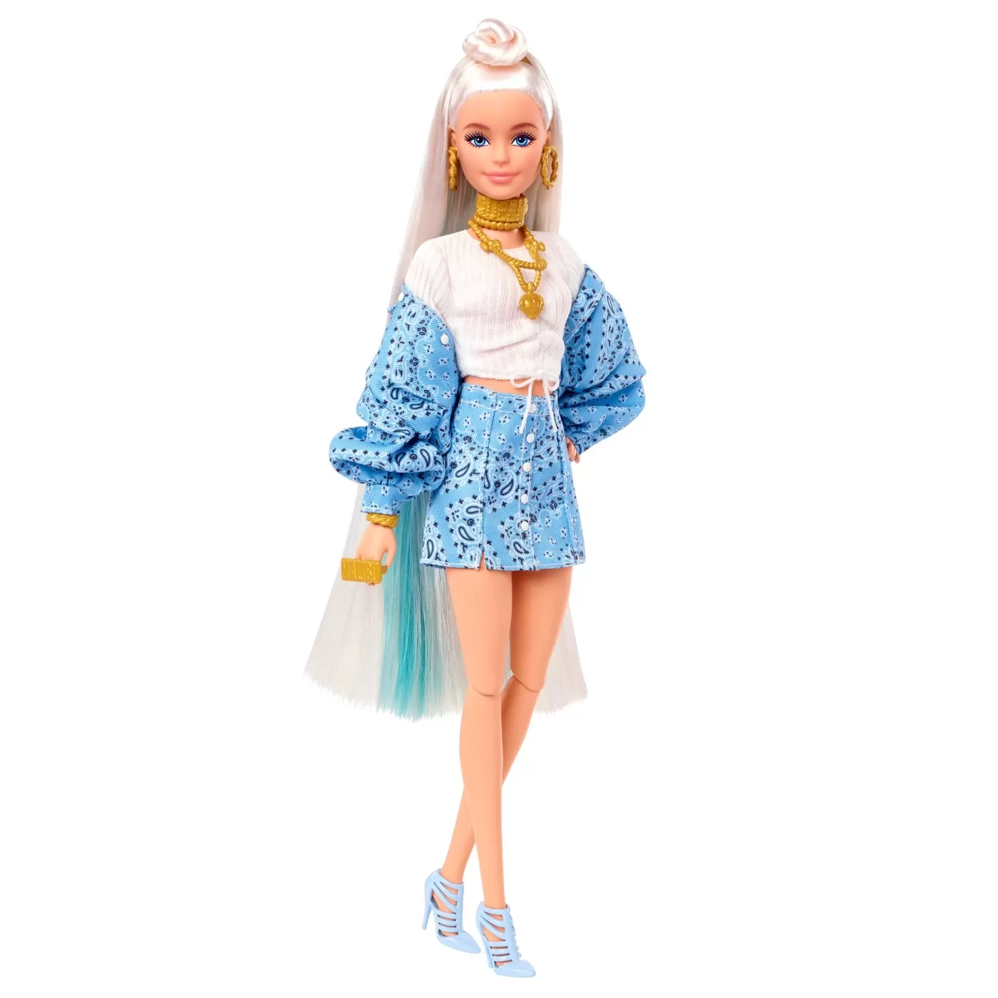 Papusile Barbie Extra etaleaza tinute indraznete si culori vii si iau atitudine! Fiecare papusa Barbie are propriul stil jucaus si extravagant. Iar animalele lor de companie, fiecare diferit si adorabil, au si ele o personalitate puternica! Barbie Extra permite copiilor sa exploreze exprimarea de sine prin stil si ofera o experienta de moda si stilizare captivanta, cu papusi articulate. Reprezinta distractie cu moda cu sclipici, ursuleti gumati, emojiuri si par distinctiv, aducand o atmosfera EXTRA oriunde merg. Fiecare se vinde separat, in limita stocului disponibil. Papusile nu isi pot mentine pozitia fara sprijin. Culorile si decoratiunile pot varia.Cand vine vorba de moda, papusile Barbie Extra au o atitudine &bdquomai mult inseamna mai mult&rdquo, cu 15 piese care includ imbracaminte si accesorii de moda, precum si un animal de companie si accesorii pentru animalul de companie.Aspectul papusii Barbie este extra, cu par blond foarte lung cu varfuri albastre, prins intr-un semi-coc.Îsi prezinta stilul increzator cu o jacheta supradimensionata cu imprimeu si fusta asortata, bluza mulata alba si pantofi cu toc albastri.O poseta texturata portocalie, ochelarii de soare aurii si numeroasele bijuterii aurii pe niveluri inspira exprimarea de sine si distractie cu povesti.Animalul sau de companie catelus chihuahua este si el foarte-EXTRA, cu ochelari de soare &bdquoPETS RULE&rdquo si o minibanda de alergare adorabila!Papusile Barbie Extra sunt cadouri excelente pentru copii cu varste intre 3 si 10 ani, in special pentru cei carora le place sa fie chiar ei extra!