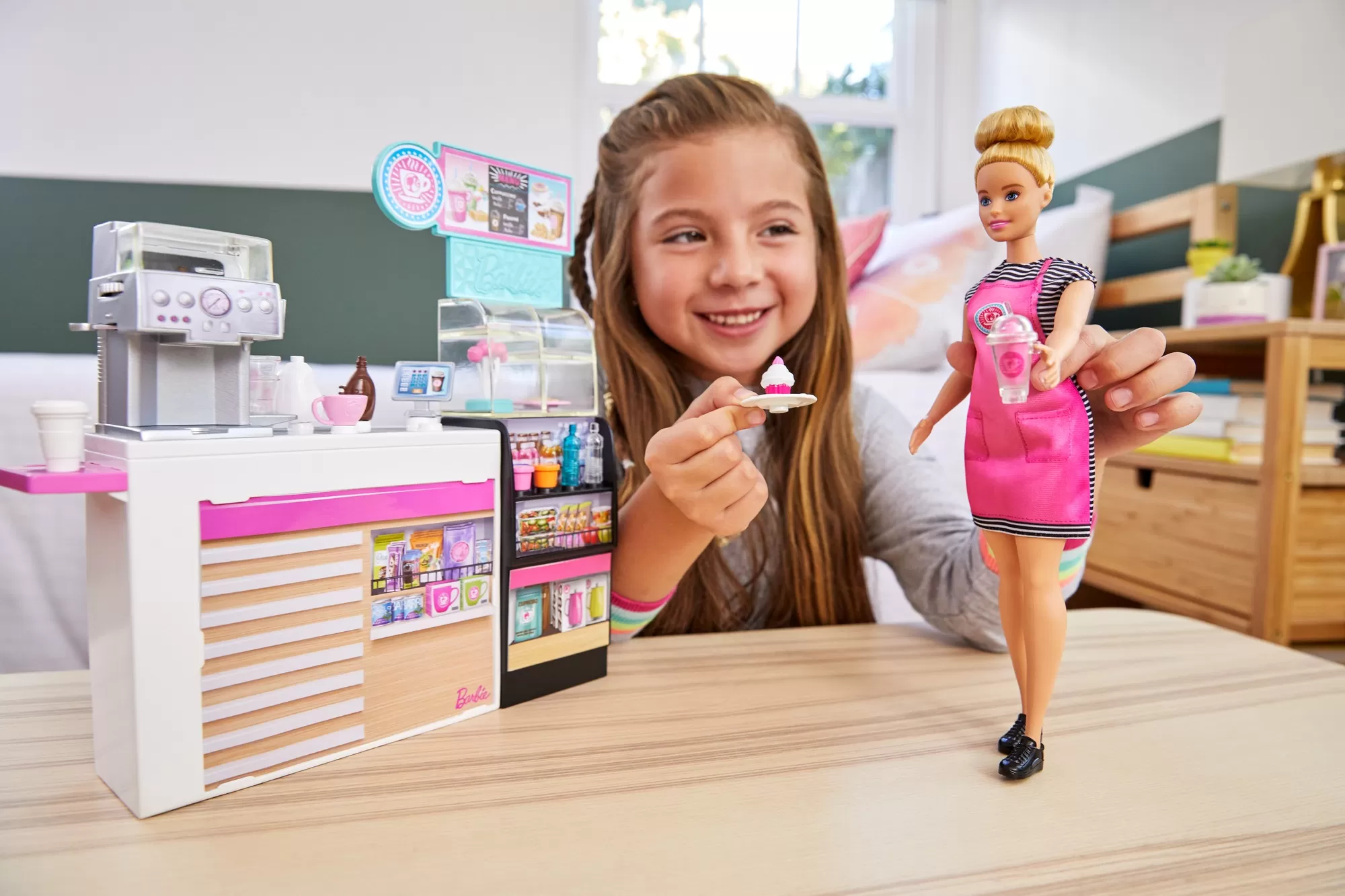 Exploreaza lumea distractiei cu setul de joaca Barbie Cafeneaua. Barbie poarta o rochie foarte draguta in dungi alb-negru si un sort roz, si este mereu pregatita sa serveasca clientii cu smoothie, cafea sau alte gustari delicioase. Acest set de joaca are foarte multe accesorii cum ar fi un ulcior de lapte, sirop de ciocolata, cani de cafea, pahare de smoothie, o ceasca de ceai si multe altele. Cafeneaua mai are si sectiunea de gustari dulci, cu placinte dulci, un tort si prajituri o sectiune rece care contine diverse bauturi racoritoare si o sectiune de alte gustari. Cand un client si-a facut selectia si comanda este gata, papusa Barbie ii poate anunta printr-un sunet sa se indrepte catre casa de marcat.