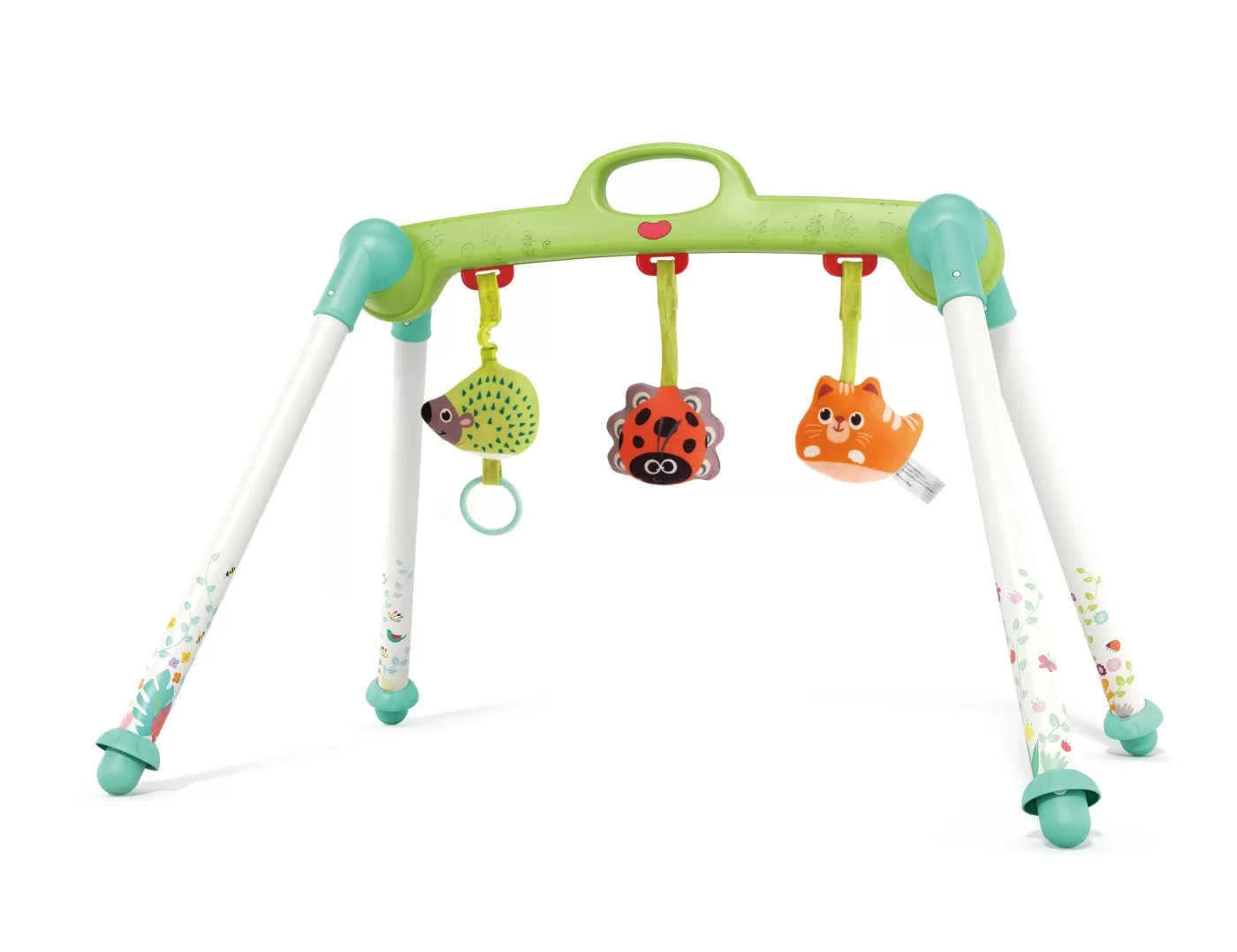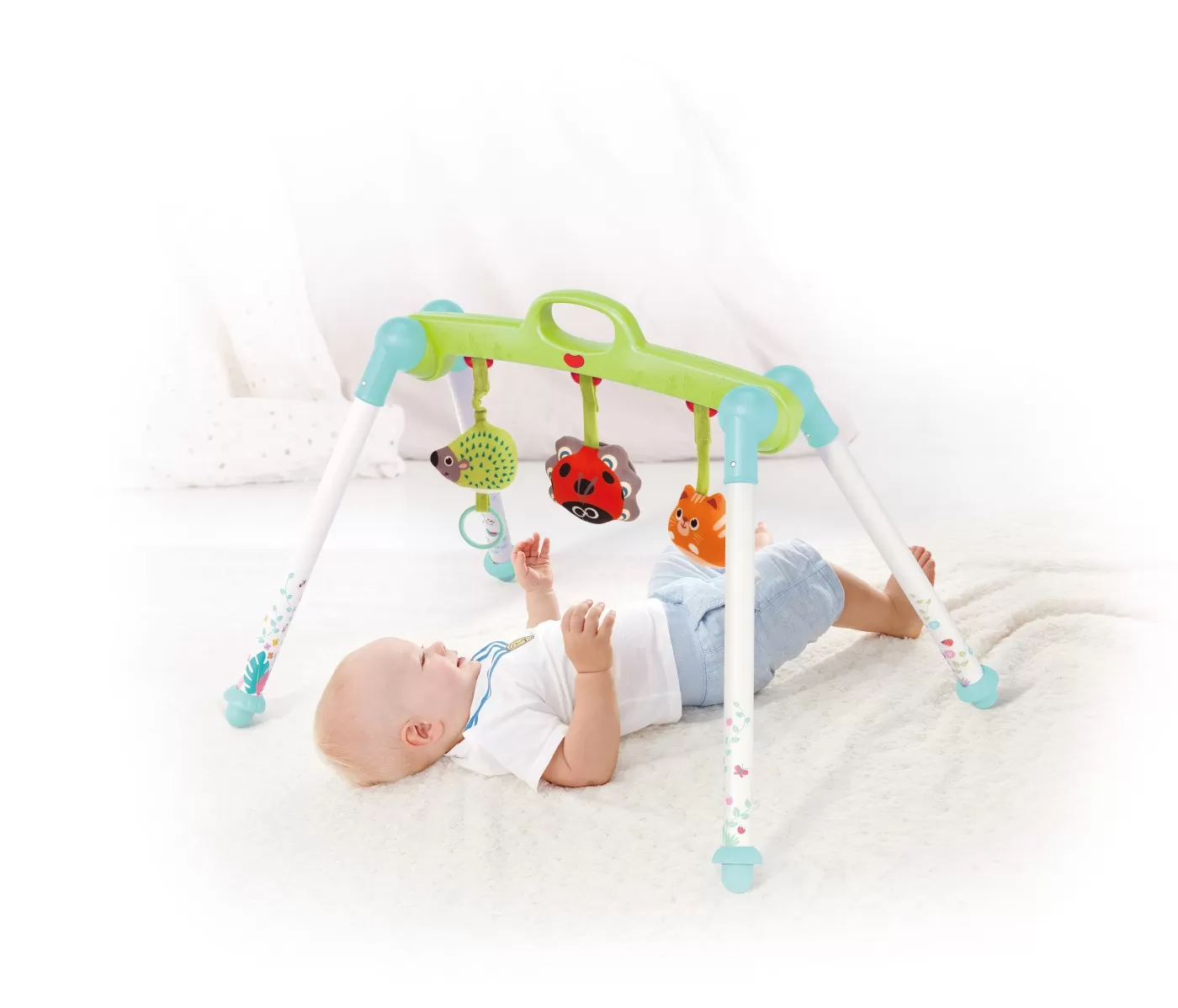 Este fabricat din material ABS si plastic durabil si de inalta calitate. Este complet sigur pentru copii. Aceasta jucarie este pentru intarirea muschilor bebelusilor si este o jucarie pentru baieti si fete. Are o baza asemanatoare cu baza unui leagan. Pliabil pentru transport usor.Poate fi folosit in 3 pozitii culcat pe spate, asezat si culcat pe burta. Prezinta 3 jucarii de plus un arici, o buburuza, o pisica.