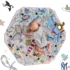 Covoras educational Kinderkraft SMARTPLAY SEA E timpul pentru o aventura subacvatica! Descopera covorasul SMARTPLAY SEA, care va va duce pe tine si copilul tau in lumea animalelor subacvatice. Designul deosebit, cele 5 jucarii de plus si posibilitatea de a transforma covorasul intr-un loc de joaca cu mingi il vor face pe copilul tau sa-l indrageasca pe SMARTPLAY SEA… si pe tine! Covorasul este potrivit chiar si pentru cei mai mici dintre copii. Sprijina dezvoltarea vazului, simtului tactil si auzului, asigurand in acelasi timp o distractie pe cinste datorita jucariilor, modelelor frumoase si celor 12 mingi colorate incluse. SMARTPLAY SEA include si o perna moale, care il ajuta pe copil sa invete cum sa stea pe burta. Atunci cand cel mic se va juca fericit, tu te vei putea relaxa, observandu-l discret pe copil, alaturi de o cana de cafea fierbinte. Cu SMARTPLAY SEA viata de parinte nu e doar mai usoara, ci si colorata, plina de aventuri marine! Covoras senzorial pentru cei mai mici copii Covorasul educational SMARTPLAY SEA este destinat chiar si celor mai mici dintre copii.Sprijina dezvoltarea vazului datorita culorilor calme, simtului tactil datorita diverselor texturi ale covorasului si auzul. SMARTPLAY invata prin joc Covoras educational 2 in 1 indeplineste 2 functii – covoras educational si loc de joaca. Trebuie doar sa ridici marginile covorasului si sa pui inauntru cele 12 mingi colorate incluse. Cel mic va fi incantat de noile posibilitati de joaca. SMARTPLAY SEA are un loc special in care copilul poate rostogoli mingile pentru a-si dezvolta precizia. Design frumos – privire incantata Culorile calme si frumosul modelul marin il vor incanta pe copil atunci cand se joaca. in plus covorasul vastarni imaginatia celor mici – creaturile marine amuzante il vor incuraja pe copil sa le atinga, iar pe parinti sa le vorbeasca despre lumea subacvatica. Jucarii detasabile si bare reglabile Covorasul include 5 jucarii detasabile un pescarus care fluiera, un avion zornaitor, o stea de mare zornaitoare, un peste cu panglici fasaitoare si o oglinjoara in forma de nor. Acestea se pot agata dupa dorinta pe bara reglabila – copilul va intinde mainile catre ele, exersandu-si vazul si apucatul lucrurilor. Barele reglabile se pot potrivi in functie de varsta si abilitatile motorii ale celui mic. Covorasul include si o perna moale, care il ajuta pe copil sa invete cum sa stea pe burta. Gros si usor – ideal pentru joaca si odihna Covorasul este gros si moale, creand astfel o buna izolatie fata de podeaua rece. Materialul placut la atingere face ca cel mic sa se joace cu placere pe covoras. Usor de curatat Covorasul este foarte usor de curatat, atunci cand copilul il murdareste sau varsa ceva cand se joaca. Baza se poate spala la masina de spalat, iar restul se curata cu o carpa umeda. Constructie Materialul poliester Produsul pliat 50,5 x 9 x 57,6 cm Produsul desfacut 103 x 95 x 55 cm Greutate 1 kg