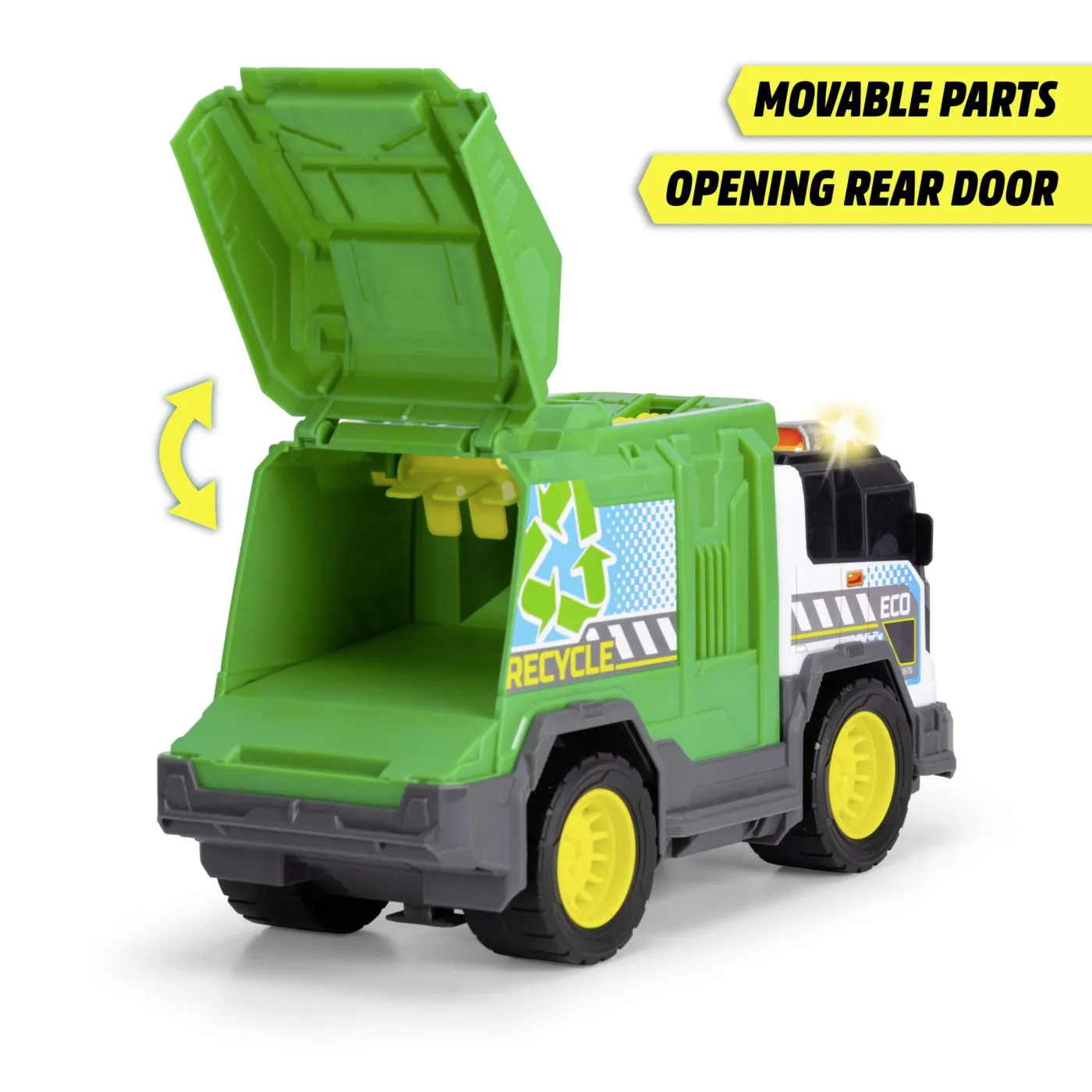 Dickie Toys – Camion de reciclare 30 cm. Camionul de gunoi mare cu functii si accesorii, jucarie pentru colectarea gunoiului pentru copii cu varsta peste 3 ani, cu lumina si sunet, incl. baterii. Copiii cu varsta de 3 ani si peste pot goli jucaus cosul de gunoi si pot transporta obiecte mici prin rotatia de gunoi in interiorul vehiculului. Cand hayonul este deschis, continutul aluneca automat din masina de jucarie de 30 cm – astfel incat camionul de gunoi sa fie rapid gata pentru urmatorul tur! Cu sunetele realiste ale pornirii motorului, bipurilor in marsarier si golirea cosului, precum si o lumina de avertizare pe acoperis, jocul cu camionul devine si mai incitanta (baterii incluse).