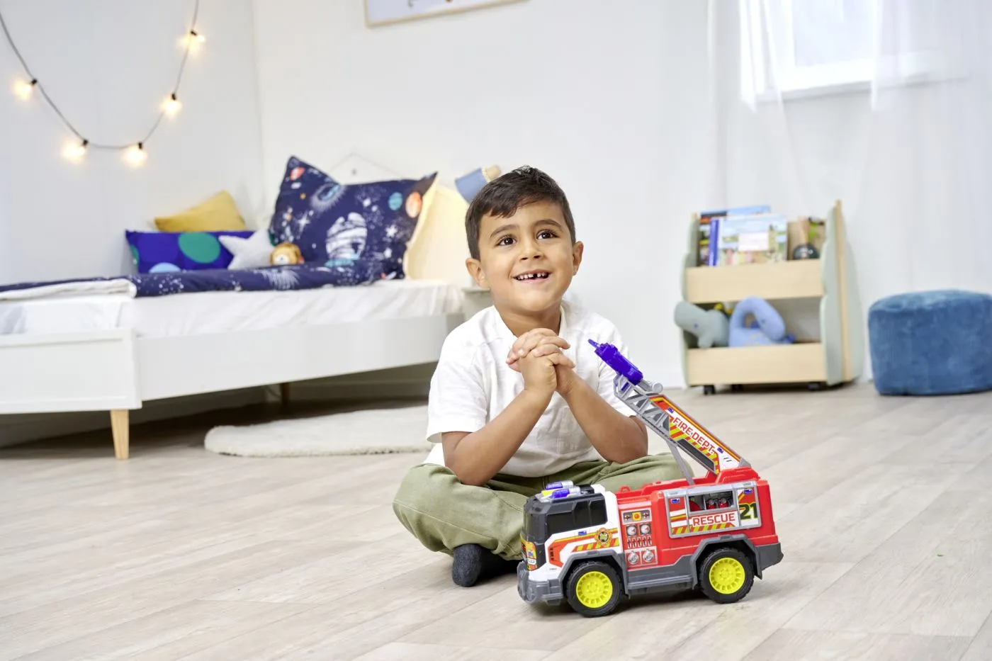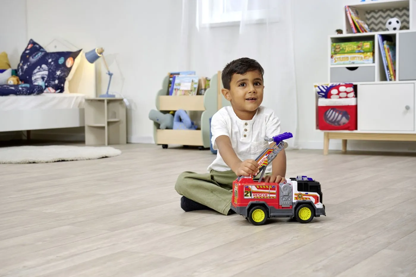 Unitate de salvare a incendiilor (30 cm) – masina de pompieri mare cu functie de tragere si scara, cu sunet si lumina. Scara masinii de jucarie vine cu un tragator de discuri, pe care copiii il folosesc pentru a trage cele 2 discuri incluse – pentru a asorta lucrurile reale cu motive de apa si drone. Partile mobile, cum ar fi scara pliabila si compartimentul lateral care se deschide, simuleaza operatiuni reale de salvare si stimuleaza imaginatia si creativitatea fetelor si baietilor.