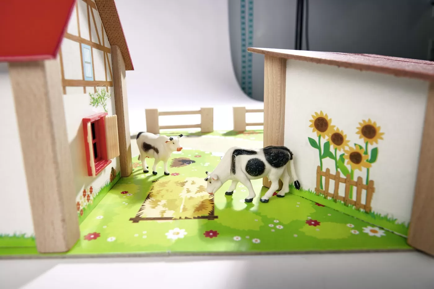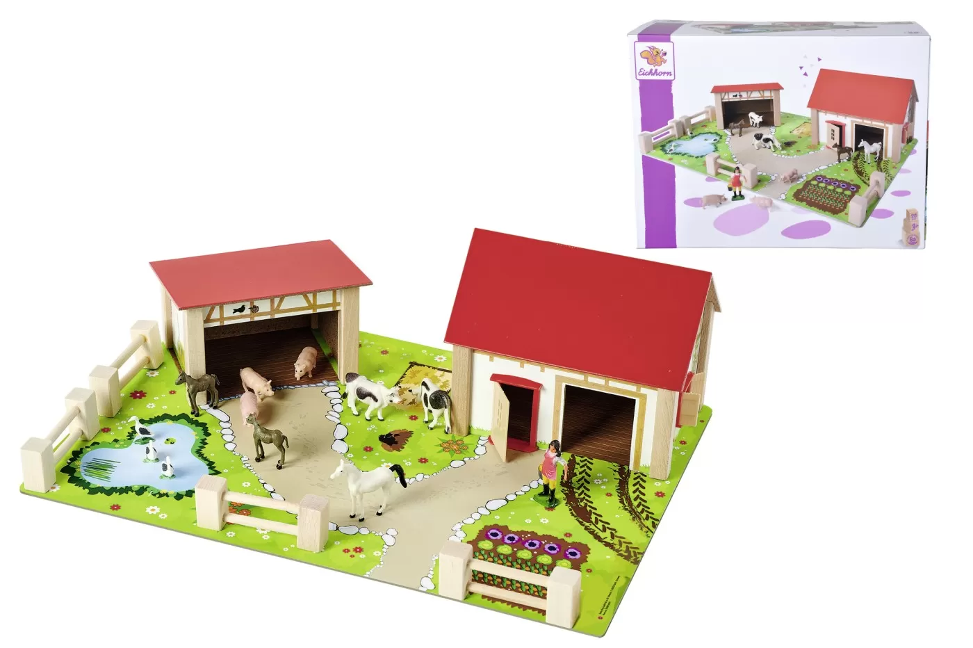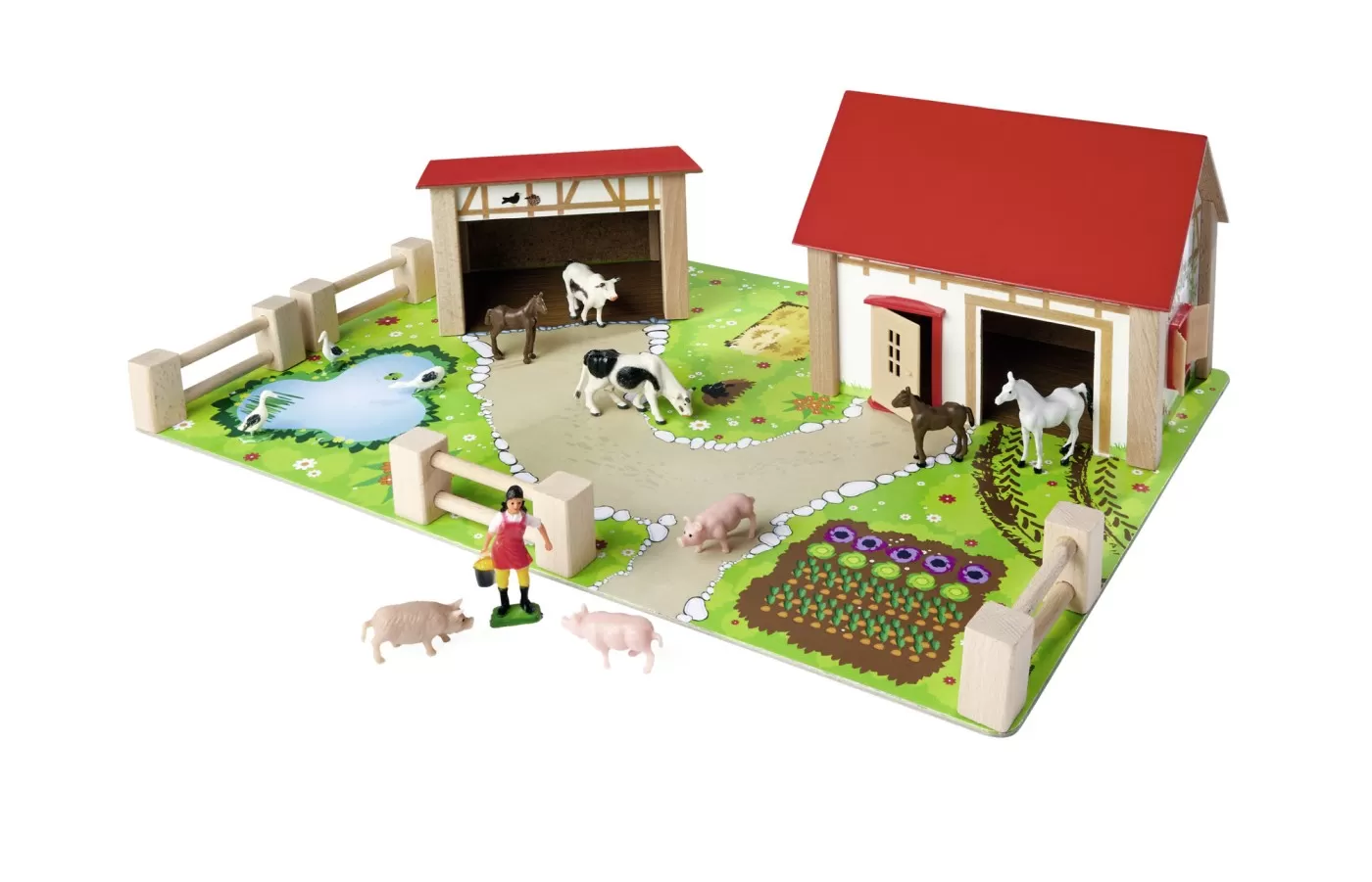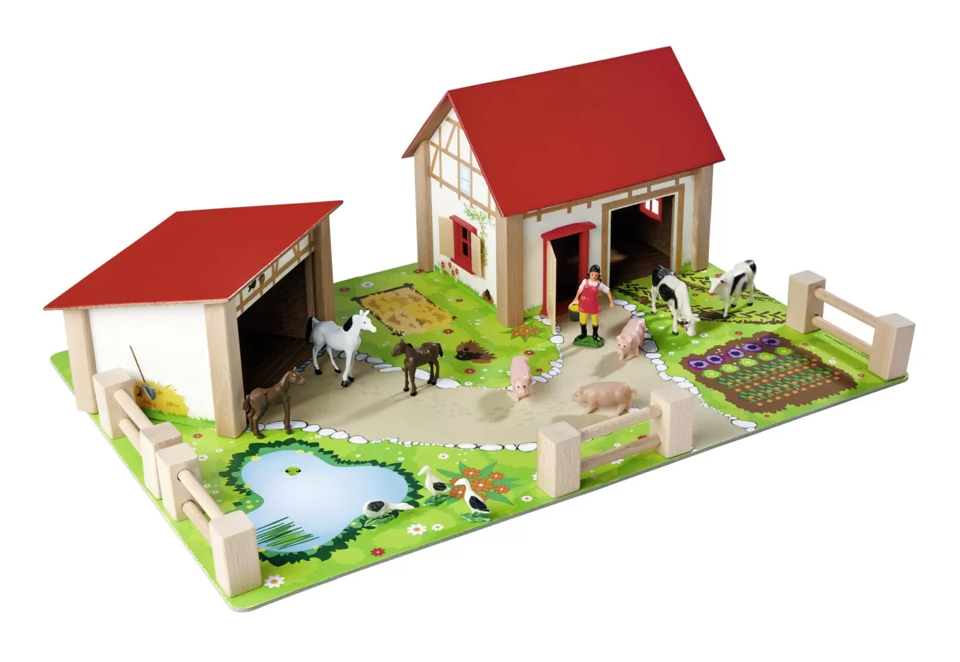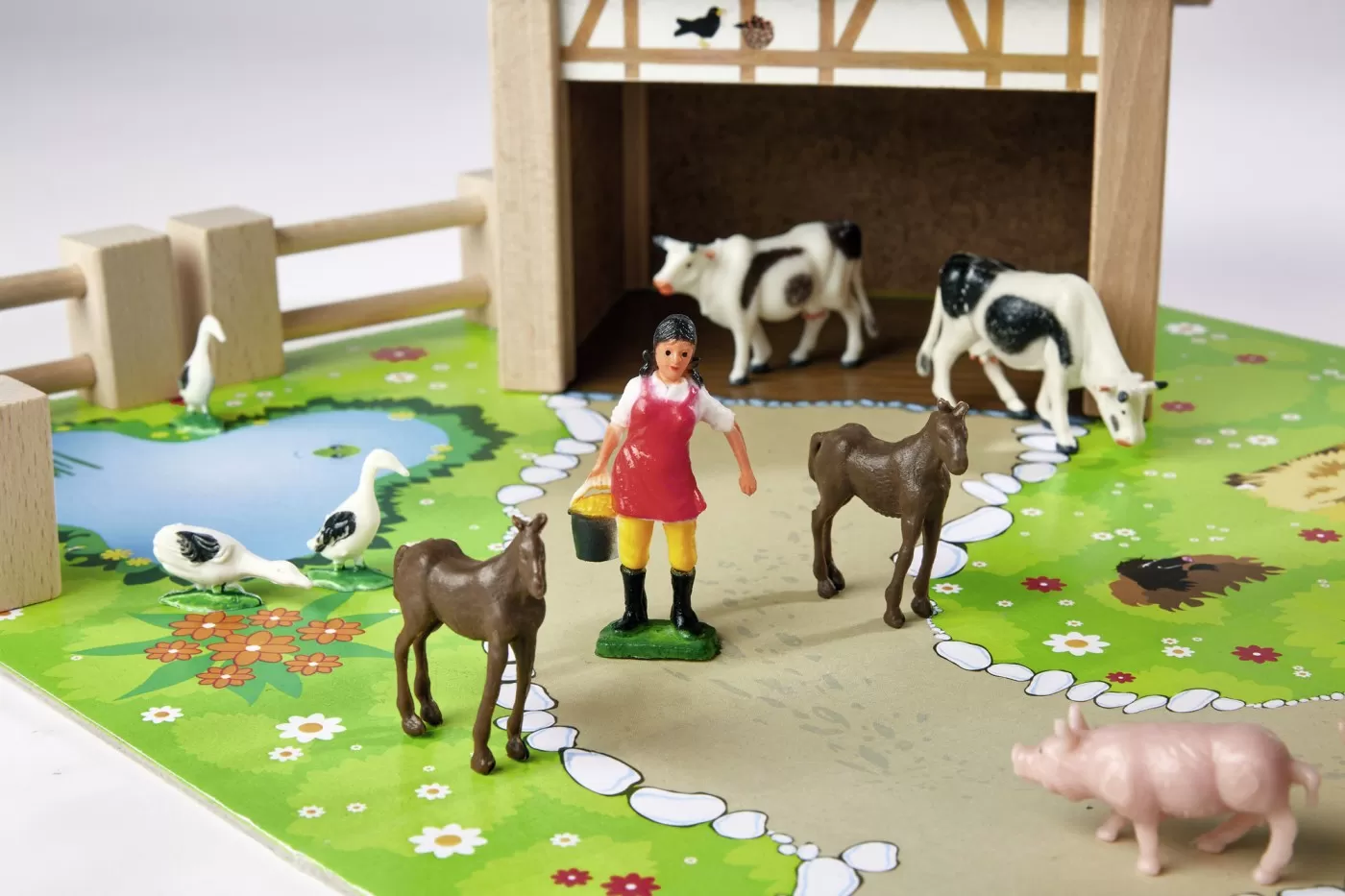 Placa de joaca cu dimensiunea de 36×51 cm creeaza o zona de joaca spatioasa. Fermierul si sotia fermierului locuiesc in ferma, iar animalele locuiesc intr-un grajd mare si confortabil. Ferma include gaste, vaci, porci si cai.