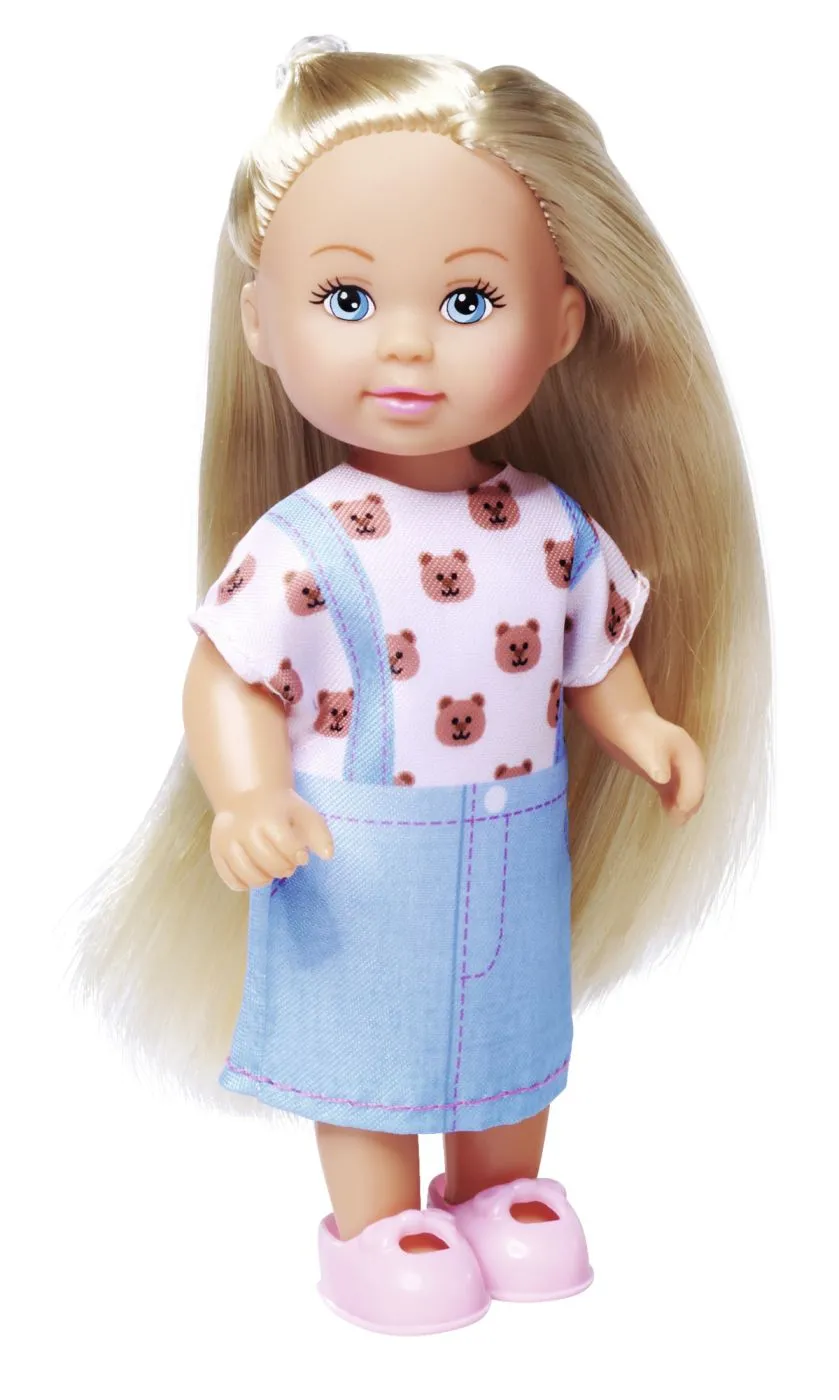 Set Fashion papusa Evi cu accesorii. Trei tinute dragute – Evi poarta o rochie din denim si vine cu alte doua tinute la moda cu imprimeuri adorabile pentru distractie creativa la imbracat. Include adidasi – Incaltamintea perfecta pentru fiecare look adidasii inclusi completeaza fiecare tinuta. Papusa la moda de 12 cm se potriveste perfect in mainile copiilor mici si este usor de luat oriunde. Perfecta pentru povesti imaginative despre imbracat, re-aranjare si joaca cu papusi. Potrivita pentru copii cu varsta de 3 ani si peste.