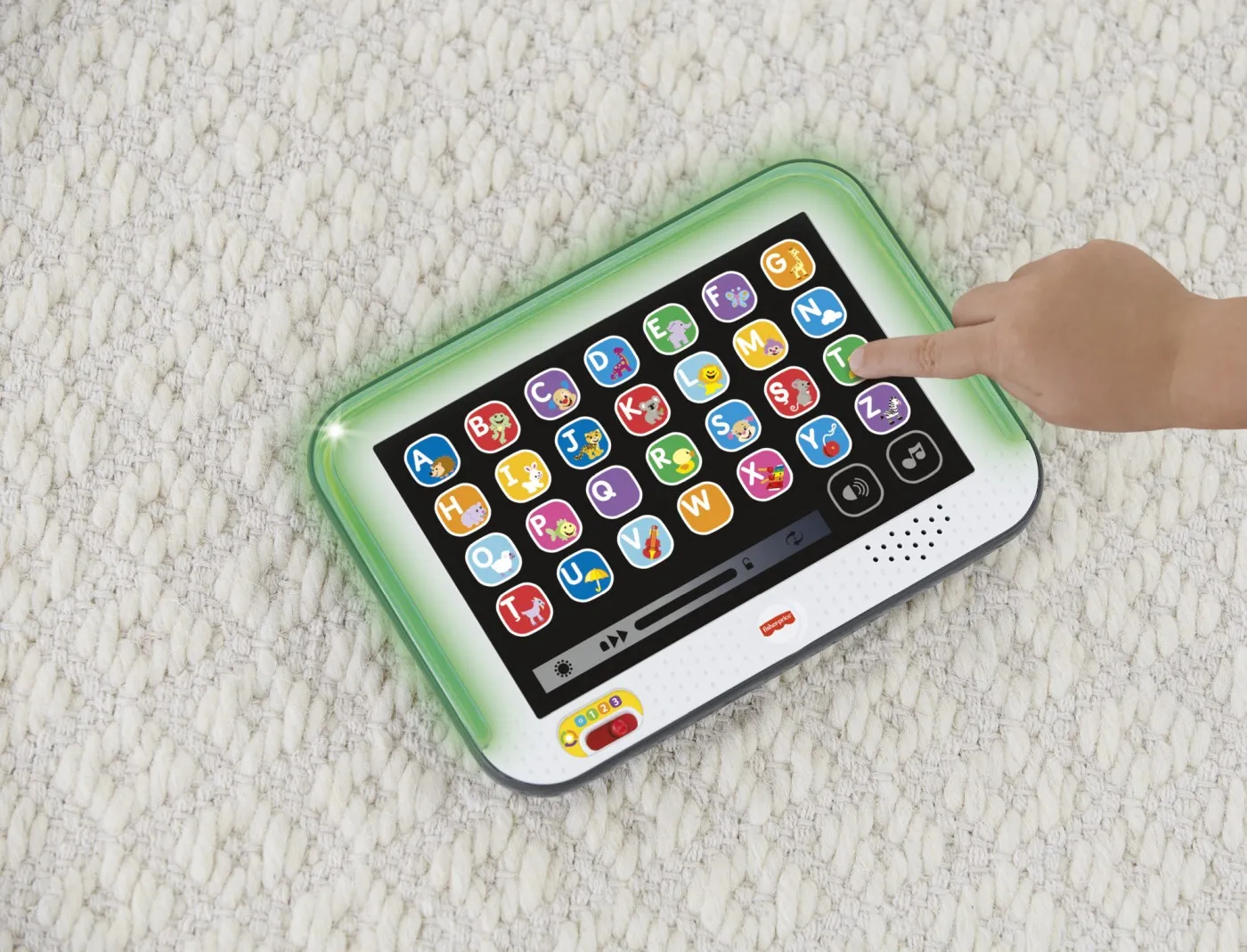 Aceasta tableta include tehnologia Etape de dezvoltare, un nou mod grozav de a schimba continutul educativ pe masura ce bebelusul creste! Deoarece fiecare bebelus se dezvolta in ritmul sau, tehnologia Etape de dezvoltare va ofera posibilitatea de a selecta etapa de dezvoltare cea mai potrivita pentru copilul dumneavoastra!Peste 100 de cantece, fraze si sunete adecvate din punct de vedere al dezvoltarii, in cele trei niveluri de joaca. Bebelusul poate apasa unul din cele 28 de butoane ale aplicatiei, pentru a activa sunete si muzica – si a debloca invatarea literelor, primelor fraze, animalelor si multe altele. Pentru a adauga si mai multa distractie, ecranul tabletei se va aprinde si va clipi in timpul cantecelor si frazelor.
