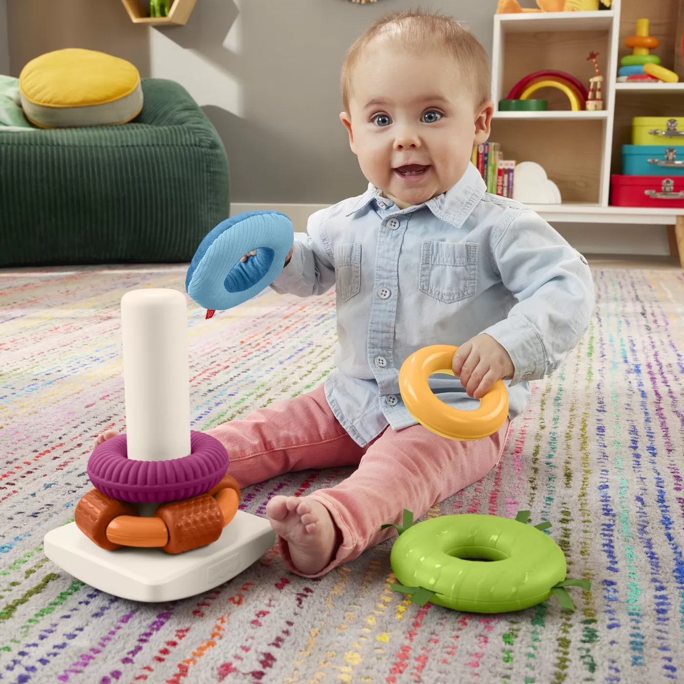 Jucaria Piramida de la Fisher-Price&reg adauga un element proaspat de distractie acestei jucarii clasice de stivuire. Fiecare dintre cele 5 inele colorate are diferite texturi, tesaturi si etichete pentru a antrena si incanta simturile bebelusului tau. Bebelusilor le va placea sa atinga, sa apuce, sa scuture si sa stivueasca inelele pe baza clatinitoare, exersandu-si abilitatile motorii fine si grosiere.