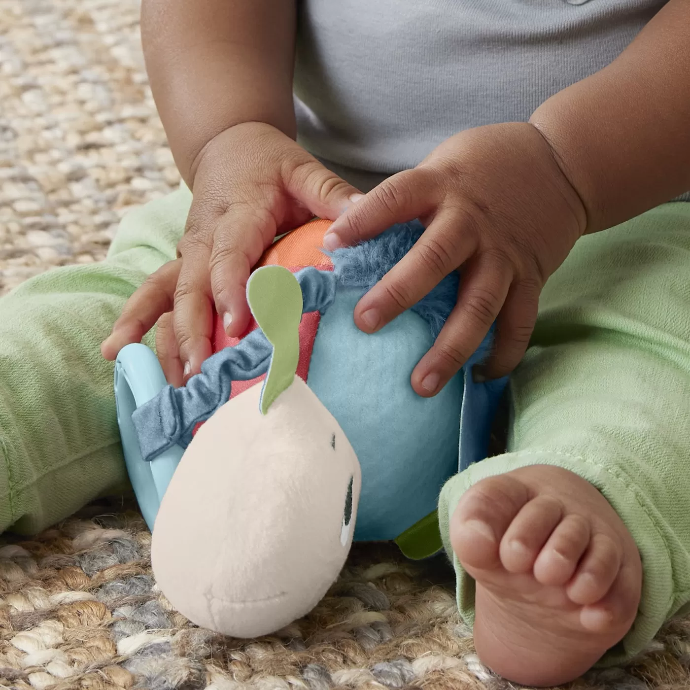 Jucaria are o varietate de elemente tactile si vizuale diferite pentru antrenamentul jocului senzorial si are un maner de tragere si eliberare care activeaza sunete distractive . tesatura colorata si texturata contrastanta realizata din plastic reciclat. Jucarie de dentitie fara BPA realizat din materiale vegetale. Aceasta jucarie ajuta la stimularea dezvoltarii senzoriale cu texturi distractive, culori stralucitoare si sunete zambete pentru a antrena simturile tactile, vizuale si auditive ale bebelusului.