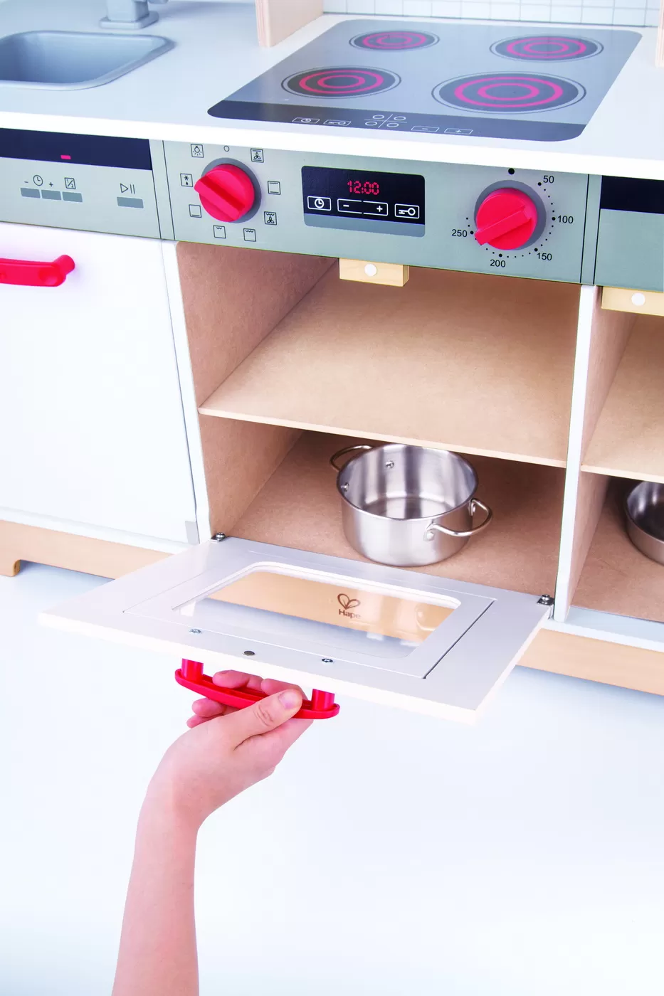Bucataria eleganta de la Hape este o bucatarie de vis in care sunt pregatite doar capodopere reale. Setul va incanta gospodina micuta cu un spatiu mare de lucru si spatiu de depozitare, precum si accesorii incantatoare. Exista o masina de cafea, o chiuveta, un cuptor, dulapuri de depozitare, un cuptor cu microunde cu o zona de clopot, o masina de spalat vase, ustensile de bucatarie si chiar un ventilator cu o lampa mica in set! Aceasta jucarie este perfecta pentru a va inspira pe cei mici sa-si faca propriile capodopere culinare! Dimensiunea jucariei 97 x 97 x 37 cm Jucariile sunt realizate din lemn, folosind materiale ecologice, vopsite in culori atragatoare cu vopsele nontoxice, care depasesc cele mai inalte si stricte standarde internationale de siguranta si calitate, precum EN71, ISO9001, ASTM F963 si altele. De multi ani, Hape a creat jucarii fantastice, de inalta calitate, folosind materiale ecologice si durabile, fiecare produs fiind atent proiectat pentru a stimula abilitatile senzoriale, fizice si emotionale.