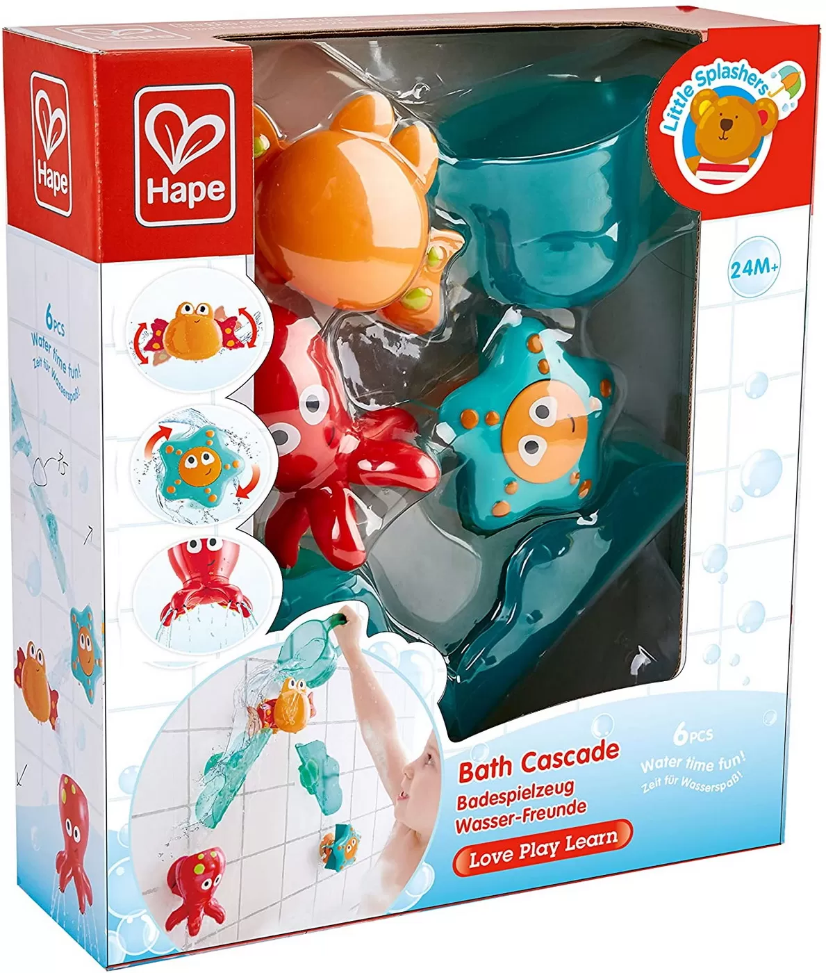 Transformati peretele baii dvs. Intr-o cascada cu acest set intelligent cu ventuze. Apa face ca animalele marine sa danseze si sa se roteasca! Atasati-le de peretele baii folosind ventuzele. Utilizati ulciorul pentru a turna apa pe animale si tobogane cu apa Include doua tobogane, trei personaje in miscare, animale marine si un ulcior Steaua de mare este o roata de apa. Pe masura ce apa se revarsa in ea, se invarte si redistribuie apa dedesubt. Crabul distribuie apa dintr-o parte in alta cu ambele gheare si parand ca danseza. Se toarna apa in caracatita si se revarsa din tentaculele sale Copiii se pot juca individual cu fiecare element sau le pot organiza in diferite configuratii in cascada. Face timpul de baie si mai distractive. invata copiii despre fluxurile de apa, gravitatia si creaturile marine Jucariile sunt realizate din lemn, folosind materiale ecologice, vopsite in culori atragatoare cu vopsele nontoxice, care depasesc cele mai inalte si stricte standarde internationale de siguranta si calitate, precum EN71, ISO9001, ASTM F963 si altele. De multi ani, Hape a creat jucarii fantastice, de inalta calitate, folosind materiale ecologice si durabile, fiecare produs fiind atent proiectat pentru a stimula abilitatile senzoriale, fizice si emotionale.