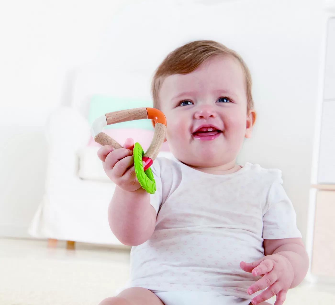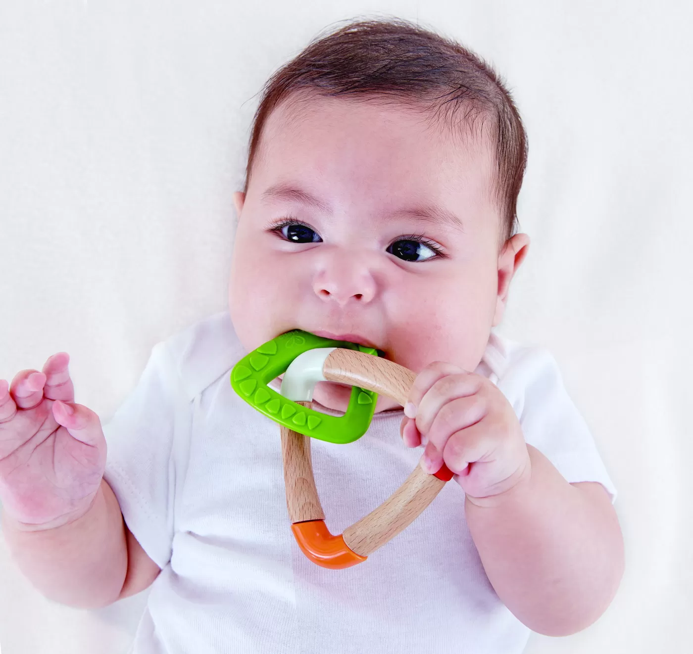 Acesta jucarie pentru dentitie ofera ameliorare bebelusului atunci cand dintii lor mici incep sa apara. Manerul din lemn este placut la atingere si sigur de mestecat, iar triunghiul pentru dinti este fabricat din silicon fara BPA. Le vor placea culorile stralucitoare si formele interesante. Cele doua componente triunghiulare colorate se rotesc una in jurul celeilalte, creand oportunitati de joc. Segmentele de lemn de pe triunghiul mai mare se invart, de asemenea, ajutand la dezvoltarea abilitatilor motorii fine. Usor de prins de bebelusi si usor de transportat si depozitat de catre adulti Jucariile sunt realizate din lemn, folosind materiale ecologice, vopsite in culori atragatoare cu vopsele nontoxice, care depasesc cele mai inalte si stricte standarde internationale de siguranta si calitate, precum EN71, ISO9001, ASTM F963 si altele. De multi ani, Hape a creat jucarii fantastice, de inalta calitate, folosind materiale ecologice si durabile, fiecare produs fiind atent proiectat pentru a stimula abilitatile senzoriale, fizice si emotionale.
