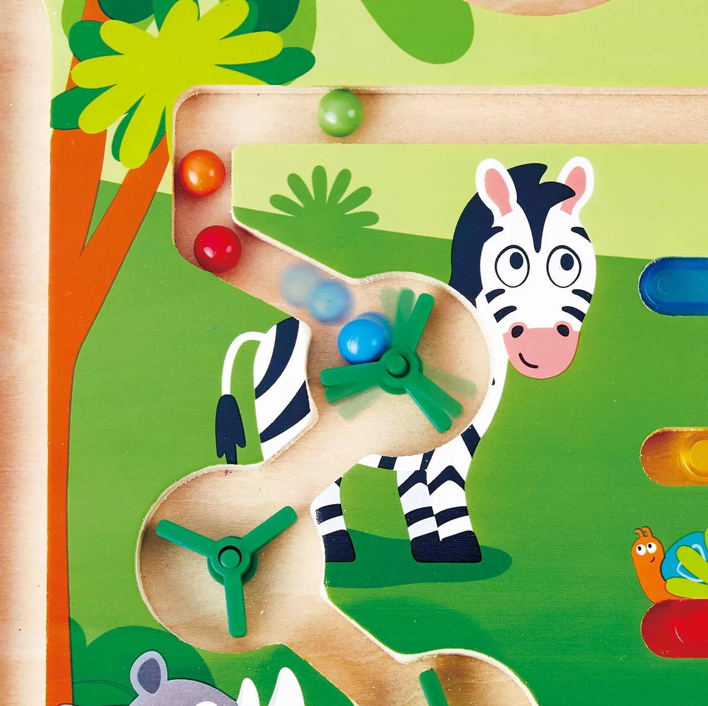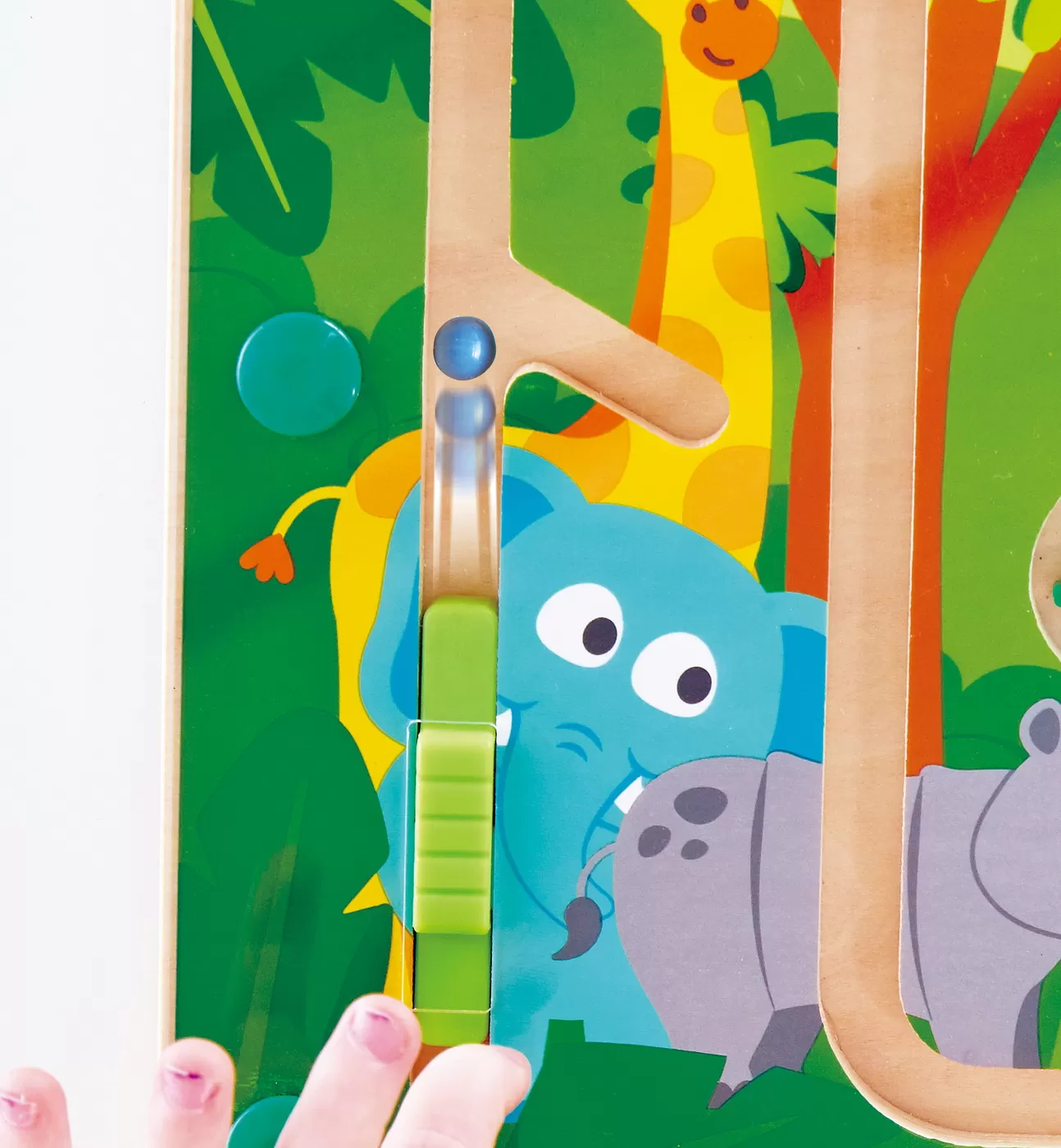 Acest labirint magnetic distractiv este un mod distractiv de a calatori prin jungla si de a afla impreuna cu prietenii nostri despre animale salbatice. Descoperiti si identificati toate cele 7 animale din jungle. inclinati placa pentru a ghida bilele prin labirint sau utilizati bagheta magnetica inclusa! Bilele sunt lansate cu un arc. Designul prezinta multe animale din jungla pentru a fi identificate. Excelent pentru dezvoltarea recunoasterii culorilor, coordonarea mainii-ochi si abilitatile de rezolvare a problemelor Perfect pentru copiii interesati de viata salbatica si natura Jucaria are un maner special, pentru a putea fi transportata usor, iar bagheta magnetica este prinsa cu snur, pentru a nu se pierde. Jucariile sunt realizate din lemn, folosind materiale ecologice, vopsite in culori atragatoare cu vopsele nontoxice, care depasesc cele mai inalte si stricte standarde internationale de siguranta si calitate, precum EN71, ISO9001, ASTM F963 si altele. De multi ani, Hape a creat jucarii fantastice, de inalta calitate, folosind materiale ecologice si durabile, fiecare produs fiind atent proiectat pentru a stimula abilitatile senzoriale, fizice si emotionale.