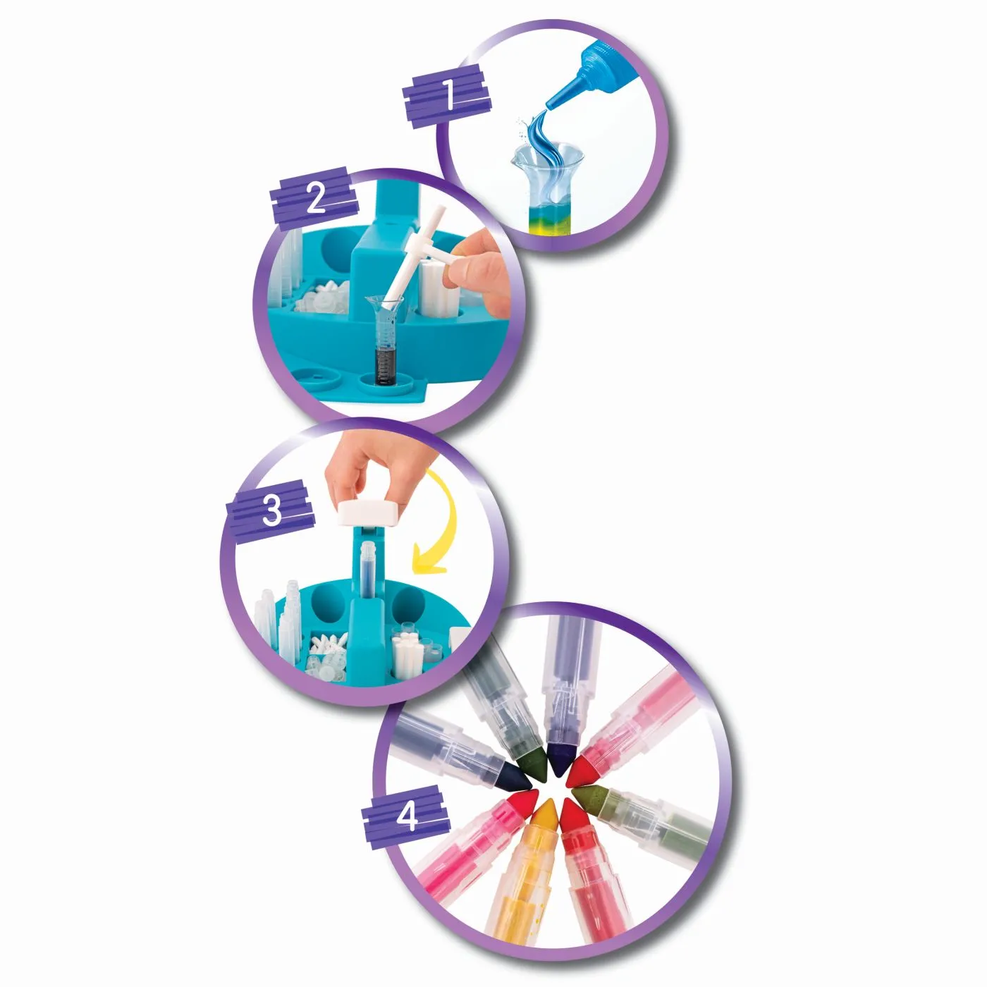 Atelierul de markere este setul ideal pentru ca cei mici sa invete sa-si faca propriile markere de la zero, atat pentru pictura acasa, cat si pentru activitatile lor de la scoala. Instructiunile pas cu pas incluse il ghideaza pe copilul tau sa utilizeze sablonul Atelierului de markere si sa realizeze 16 markere intr-un mod usor si distractiv. Pentru a crea markerele, copiii pot folosi cernelurile incluse ca atare, le pot amesteca conform instructiunilor sau chiar isi pot folosi imaginatia pentru a crea propriile nuante unice. Setul include atelier de confectionare a markerelor, cutie de depozitare pentru markere, manual de amestecare a culorilor, 3 sticle de plastic cu 3 culori diferite de cerneala, accesorii pentru a crea 16 markere, 2 dozatoare, 10 pagini A5 goale, 16 autocolante pentru markere, manual de instructiuni.