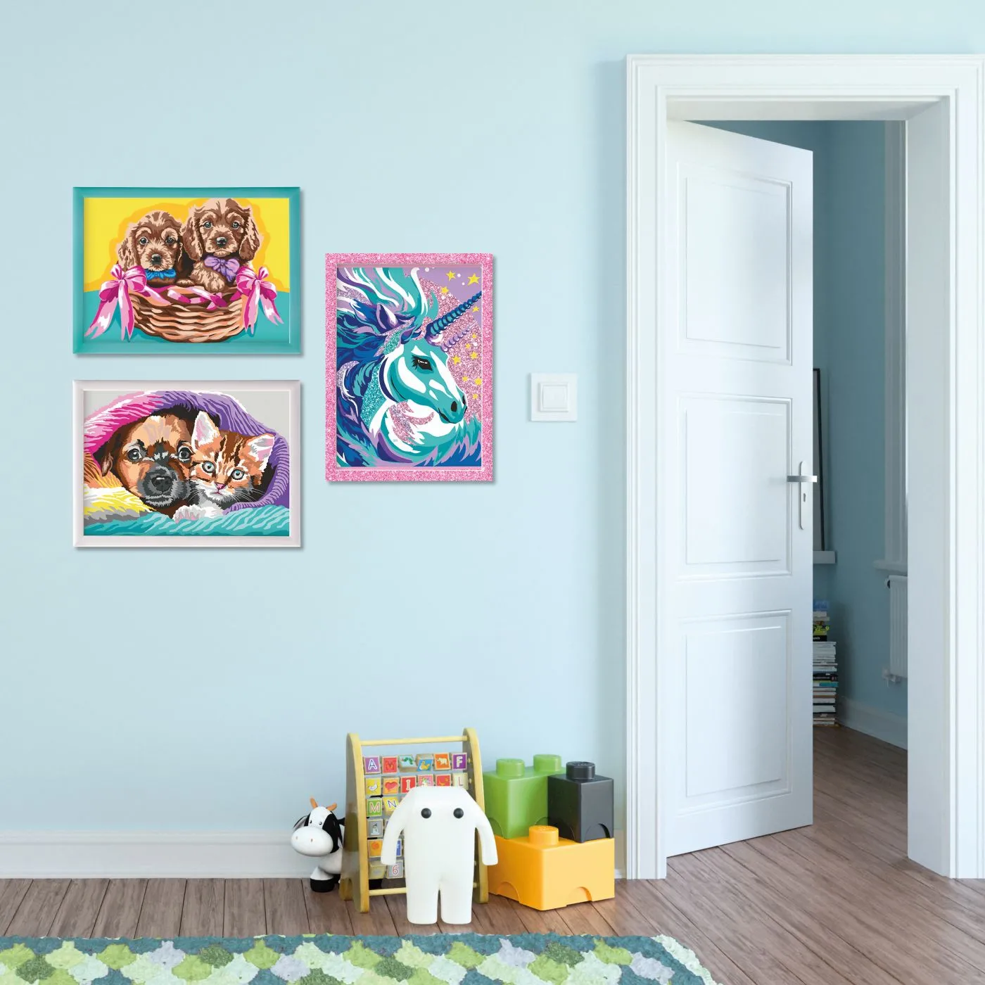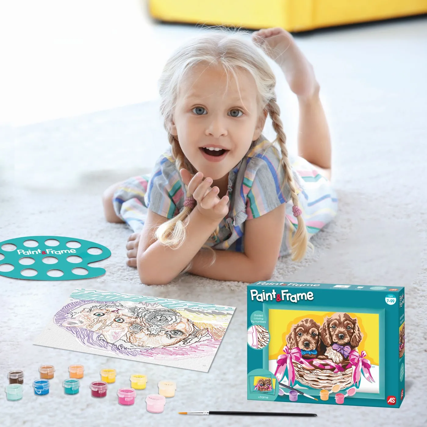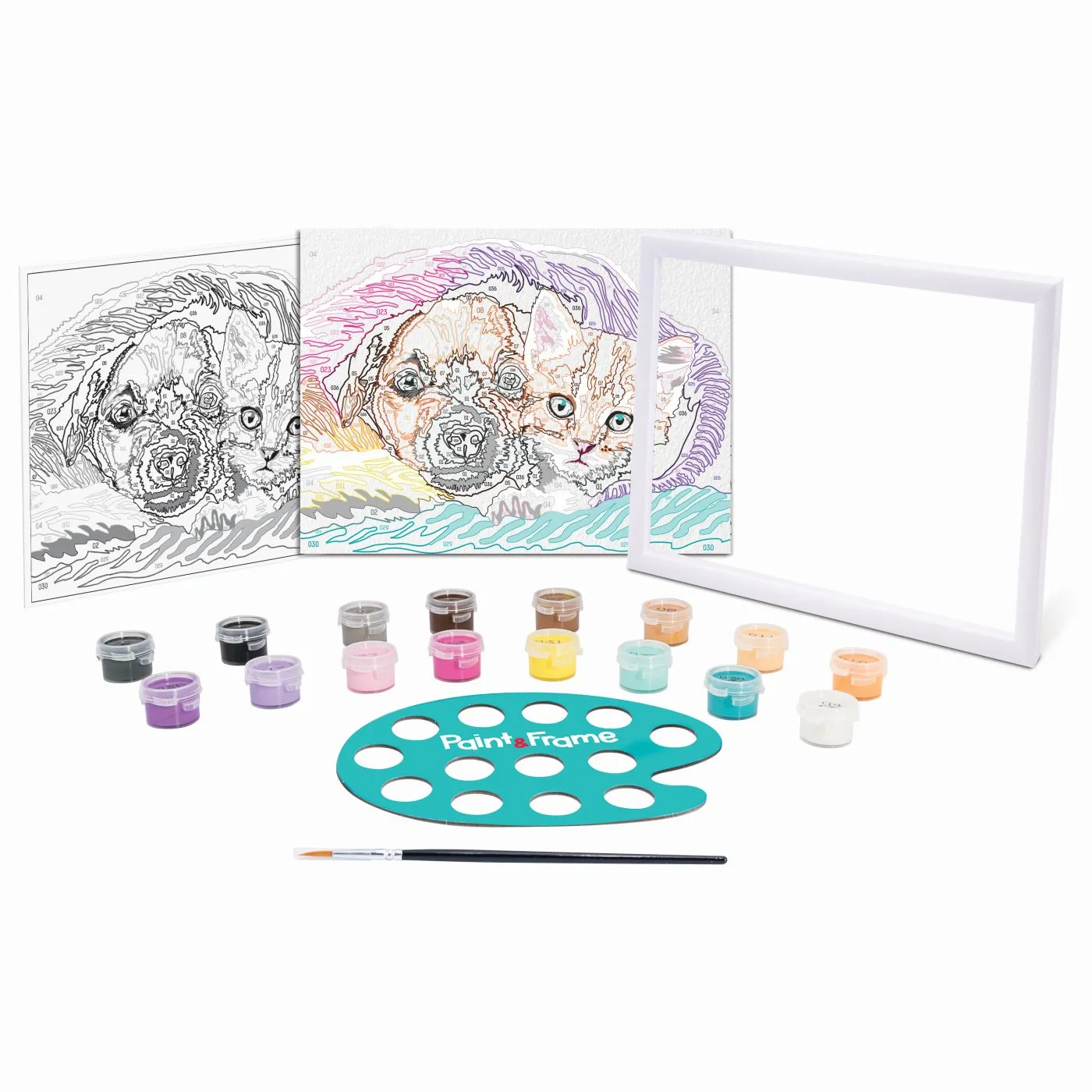 Setul include 1 cartonas preimprimat cu un design de caine si pisicuta, 16 vopsele acrilice in borcane de plastic,1 rama din plastic,1 pensula. Tema dulce prietenie. Copilul vede ce culoare corespunde fiecarei zone si o picteaza in consecinta. Rezultatul este foarte satisfacator, deoarece colorarea cartonului este ghidata.