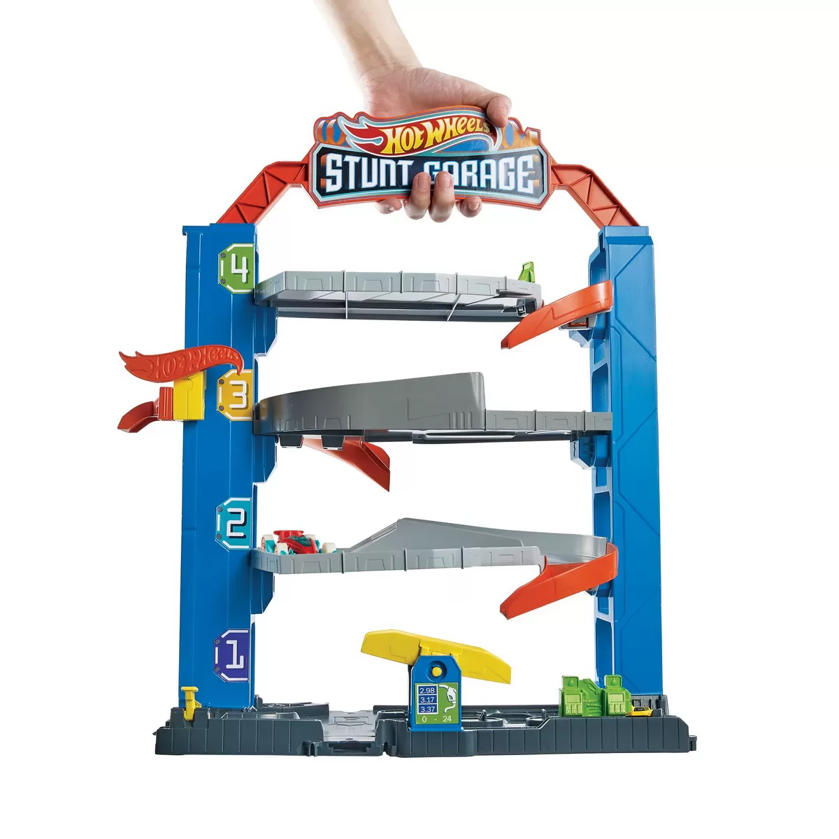 Garajul de la Hot Wheels are dimensiuni generoase si ofera o multime de posibilitati de joaca. Utilizati liftul pentru a aduce masinile la orice nivel vreti sa parcati sau mergeti la un etaj inferior printr-un singur salt. Garajul poate depozita peste 20 de masinute. Cei mici pot face o vizita la service sau la benzinarie pentru a fi pregatiti de urmatoarea aventura. Garajul cu cascadorii Hot Wheels are un maner astfel incat e foarte usor de strans si transportat. Setul de joaca Garajul cu cascadorii se poate conecta cu alte seturi si piste Hot Wheels. Setul include 1 masinuta Hot Wheels 1 la 64.