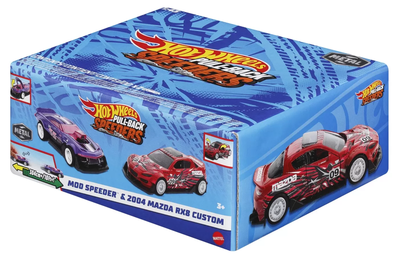 Pachetul de 2 masini cu cu sistem pull back de la Hot Wheels Speeders promit curse interesante. Masinile pot fi trase inapoi si eliberate pe podele si covoare pentru o cursa interesanta. Toate masinile la scara 143 ofera o caracteristica interactiva grozava, de ex. Rolomatice pentru usi, clapete de portbagaj si capote care pot fi deschise.Decoratiunile detaliate fac ca inimile copiilor si colectionarilor sa bata mai repede. Vehiculele Hot Wheels Speeders sunt un cadou grozav pentru copiii de la 3 ani in sus. Acest pachet contine masinutele Mod Speeder si 2004 Mazda RX8 Custom.