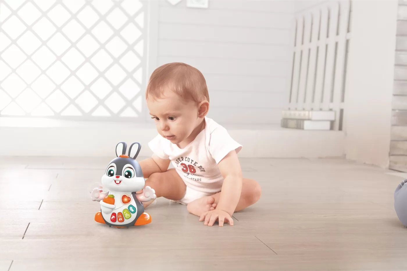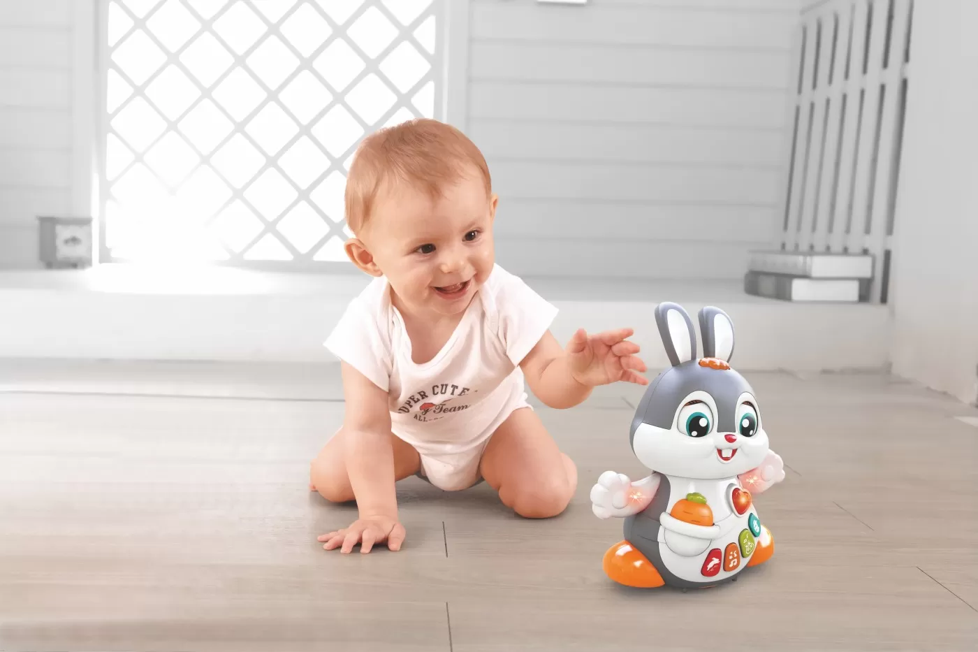 Iepurasul dansator interactiva de la Hola Toys este gata de joaca! Apasa butonul de pe capul lui si iepurasul incepe sa se miste, sa cante, sa de din maini si i se aprind luminite. Muzica si culorile vii sunt atractive pentru cei mici care nu se vor plictisi usor de aceasta jucarie. Iepurasul are cinci butoane care activeaza diverse actiuni ale jucarei. Acestea pot declansa sunete de pisicuta, diverse melodii sau un sunet care imita bataile inimii. Sunetul poate fi ajustat pe mut daca vreti ca cel mic sa se joace in liniste. Atunci cand canta, pisicuta stie sa clipeasca. Toate aceste optiuni fac ca jucaria sa fie extrem de realista si interectiva. Pisicuta stie sa cante 8 melodii.