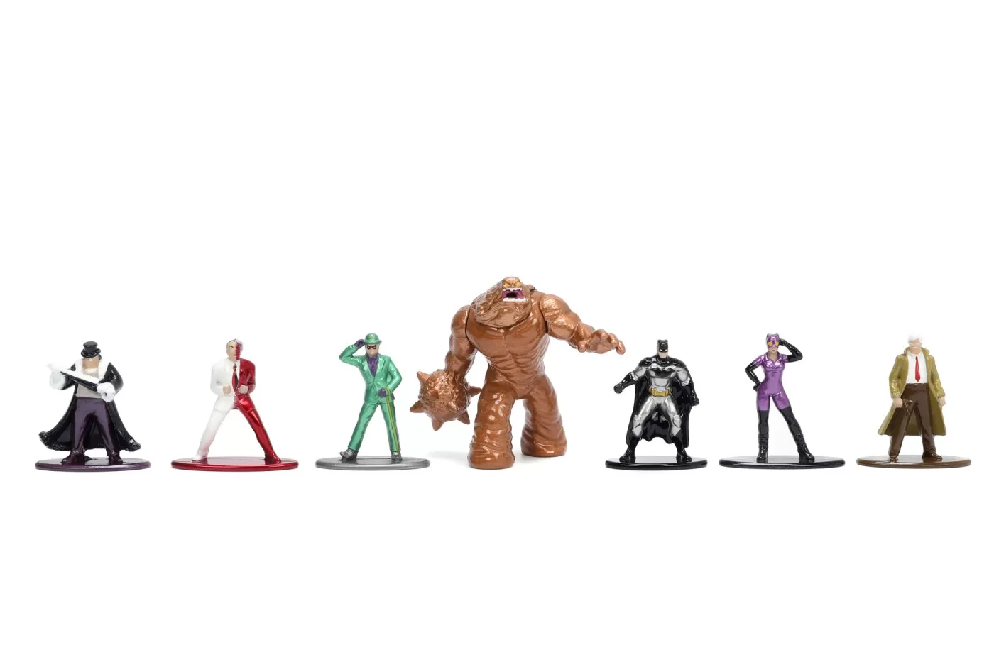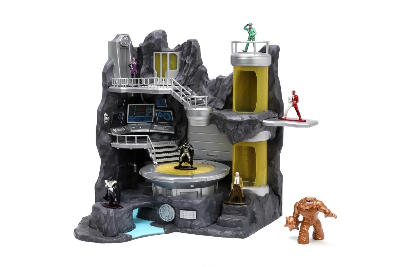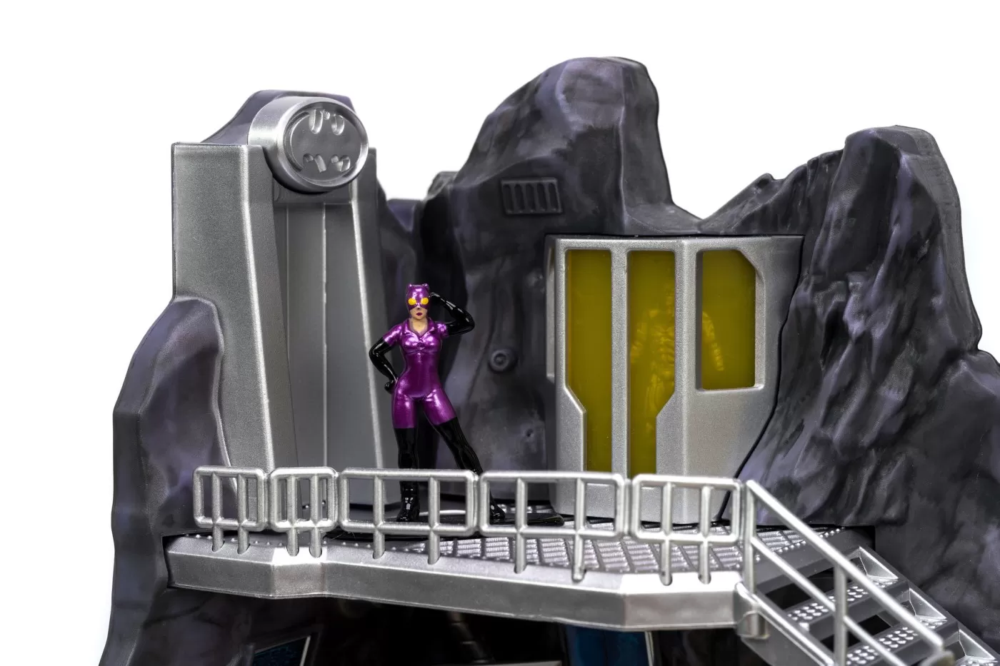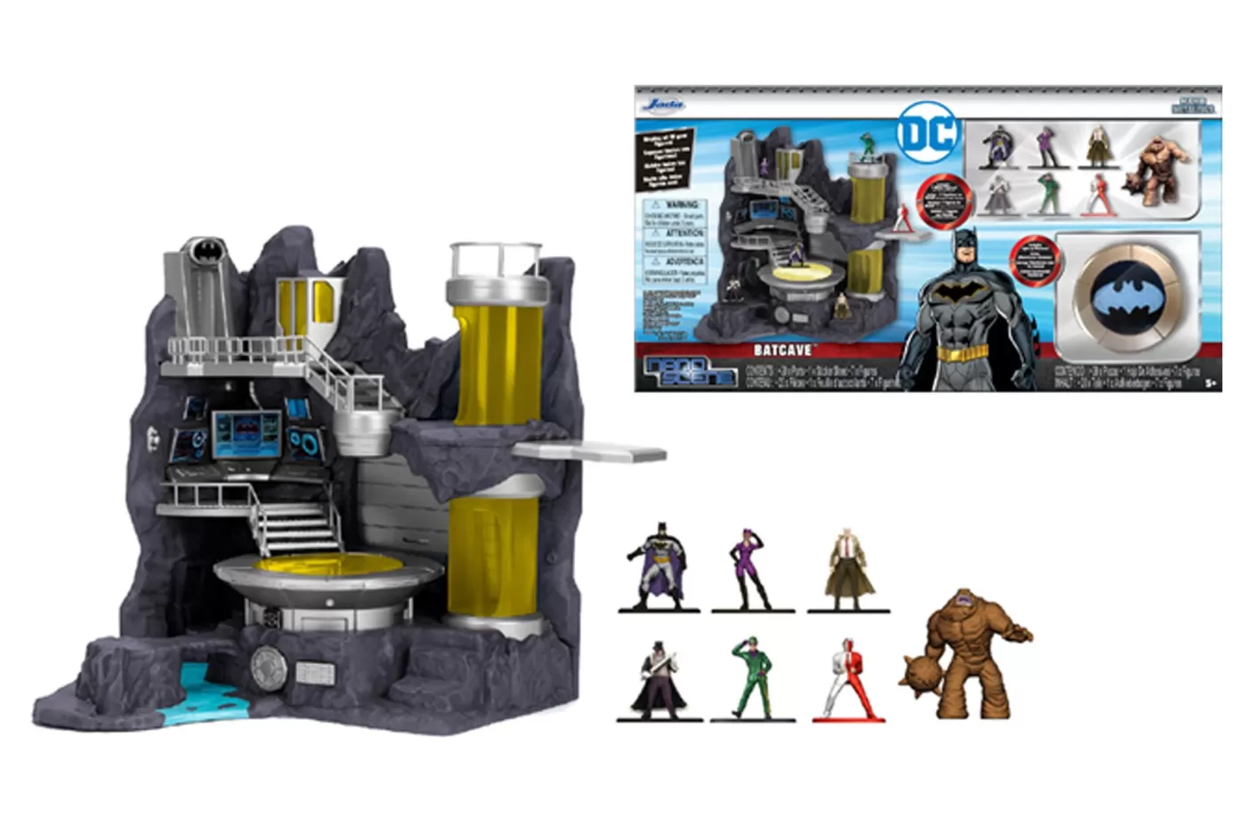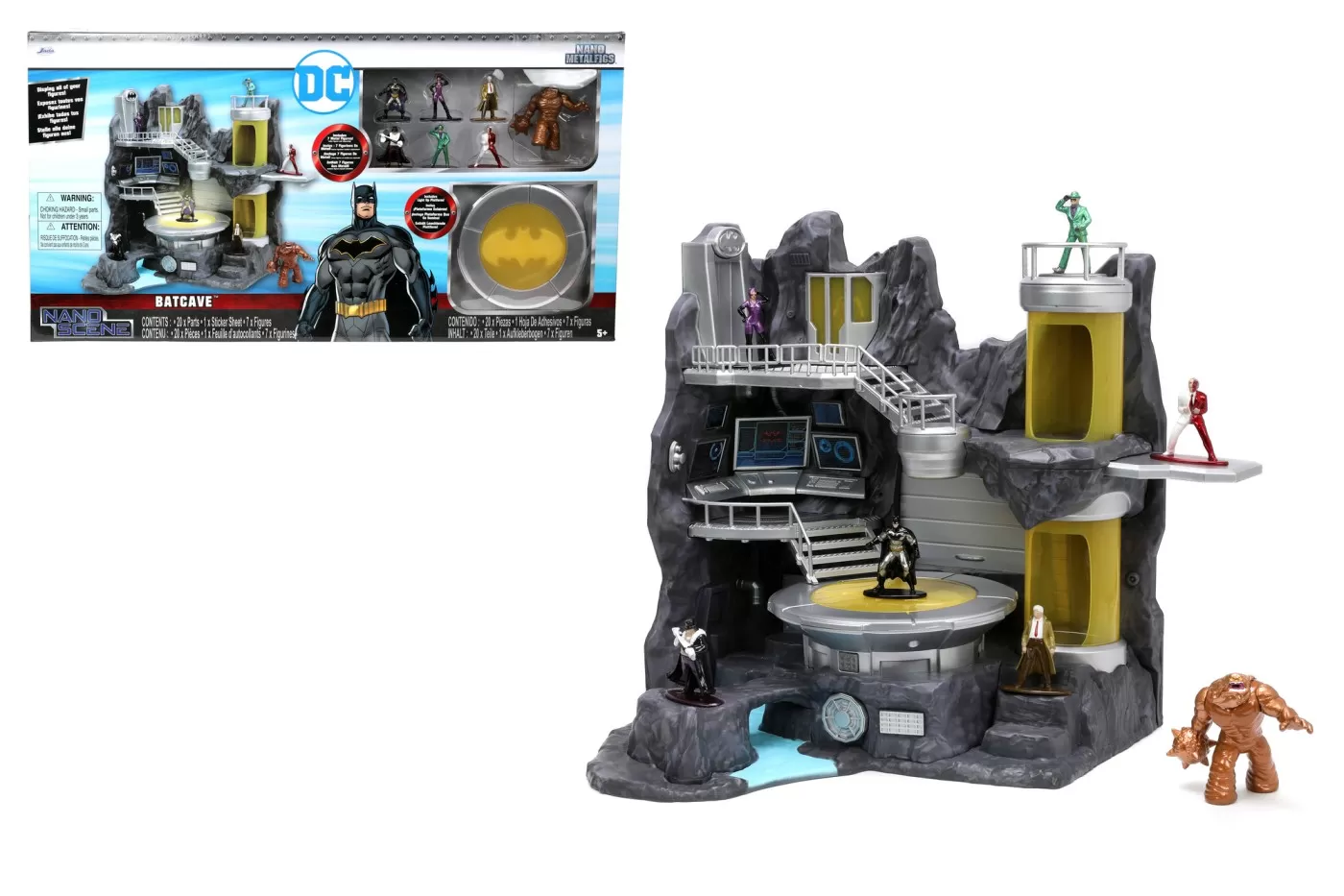 Pestera lui Batman include 6 nano figurine metalice de 4 cm si 1 figurina metalica medie, o platforma cu lumina, usa glisanta usoara si foaie de autocolante pentru decorare. Dimensiuni (L x L x A) 33 x 24 x 27 cm.