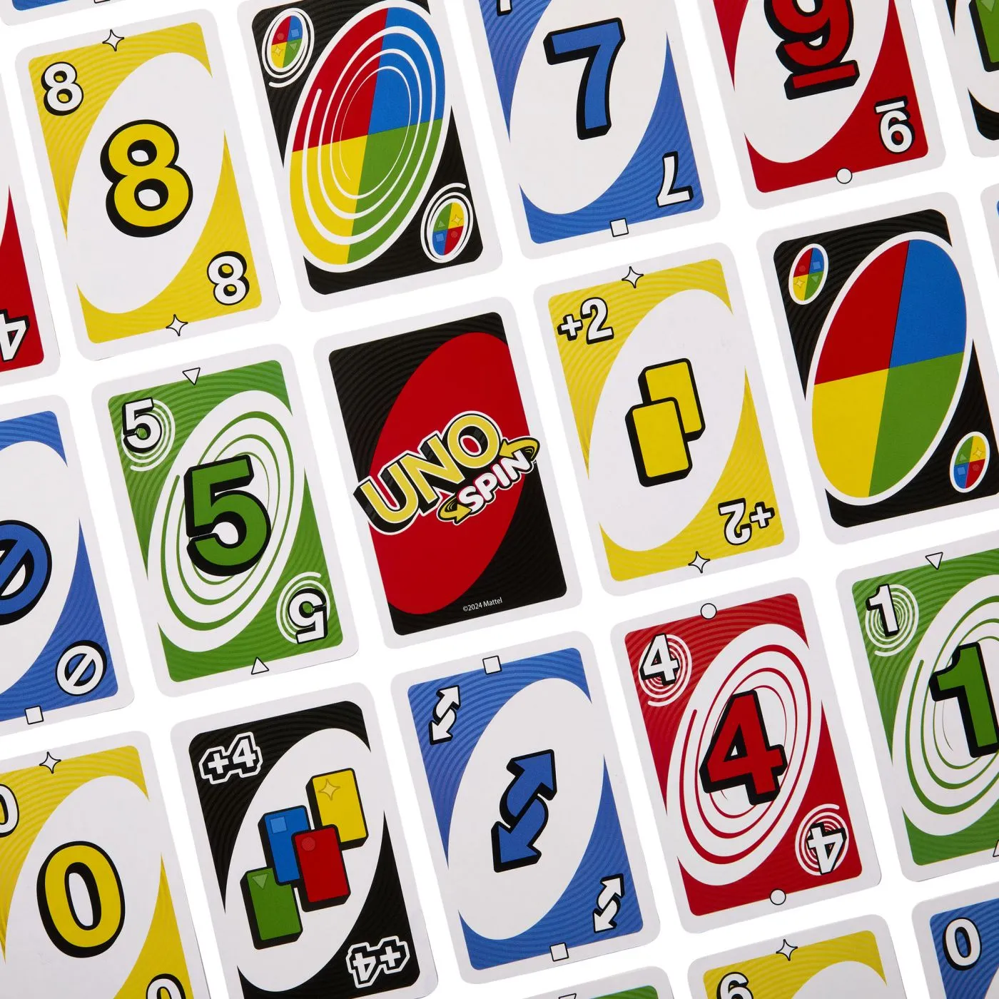 UNO Spin ofera o versiune diferita a jocului clasic UNO si este ideal pentru toata lumea. Jucatorii joaca pe rand carti UNO, potrivind culoarea, numarul sau actiunea pentru a scapa de toate cartile lor. Cand se joaca o carte Spin, jucatorul invarte roata si urmareste actiunea. Exista diferite posibilitati de rotire, cum ar fi desenarea culorilor, schimb de maini, eliminare culoare, rotire dubla. Poate schimba cursul jocului, mai ales daca cineva uita sa strige &bdquoUNO!&rdquo. Jocul include 112 carti si 1 roata de invartit. Potrivit pentru ore nesfarsite de joaca si pentru copiii peste 7 ani care iubesc jocurile de societate cu carti.
