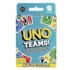 UNO Teams este un nou mod de a juca jocul clasic! Jucatorii sunt in continuare potriviti dupa culoare, numar si simbol, dar in loc ca fiecare persoana sa fie pe cont propriu, ei se imperecheaza si joaca impreuna pentru a castiga. Cartile si regulile speciale ii ajuta pe coechipieri sa lucreze impreuna, dar ambii jucatori trebuie sa scape de toate cartile din mainile lor pentru a castiga. Si nu uita, cand tu (sau partenerul tau!) ajungi la ultima carte, nu uita sa strigi &bdquoUNO!&rdquo UNO Teams este inca jocul clasic pe care jucatorii il cunosc si il iubesc, dar jucat in echipe de cate doi! Cartile speciale precum Wild Team Play si Wild Team Draw 4 ajuta echipele sa castige impreuna. Joaca o carte cu simbolul pass si jucatorii pot pasa o carte la alegere partenerului lor. Daca un coechipier iese din joc, acesta ia jumatate din cartile din mana partenerului sau si continua jocul. Nu uitati, atunci cand jucatorii ajung la o singura carte, ei (sau partenerul lor) trebuie sa strige &bdquoUNO!&rdquo