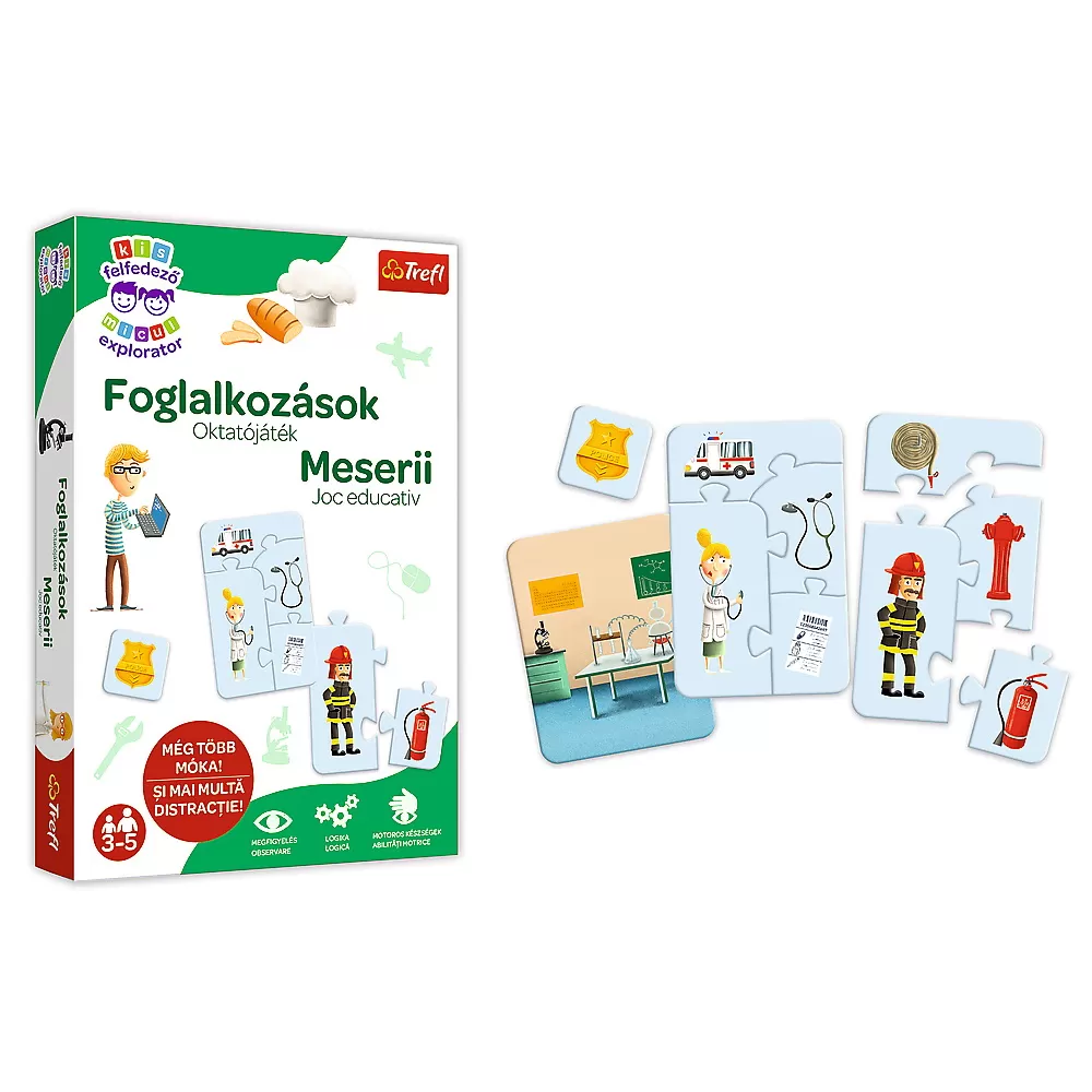 Meserii este un joc de puzzle pentru copiii mici prin intermediul caruia acestia vor ajunge sa cunoasca ce inseamna munca in diferite meserii si care sunt instrumentele necesare pentru o anumita profesie. În timpul jocului, copiii isi imbogatesc vocabularul cu privire la diverse meserii, exerseaza vorbirea pe anumite teme si isi dezvolta curiozitatea cognitiva.