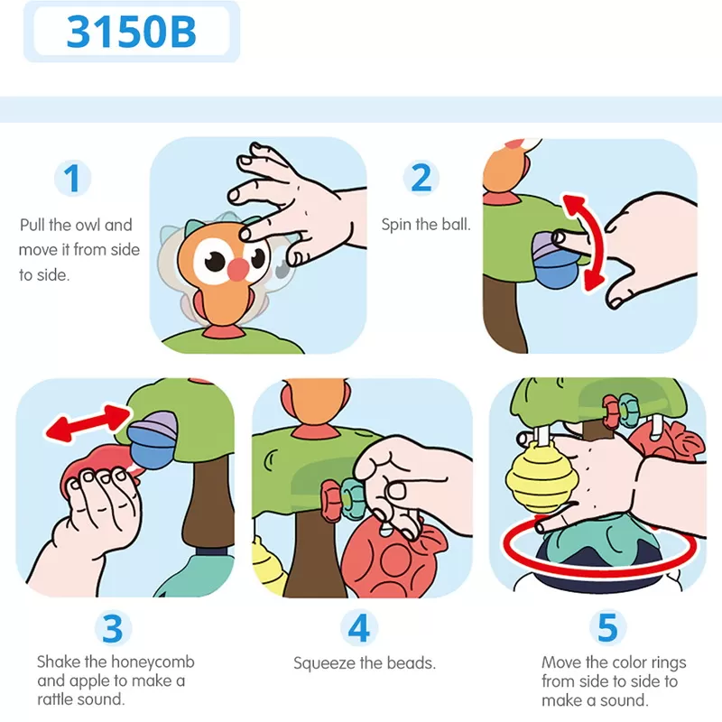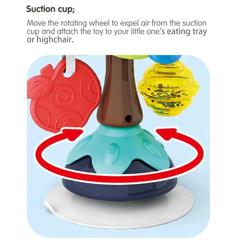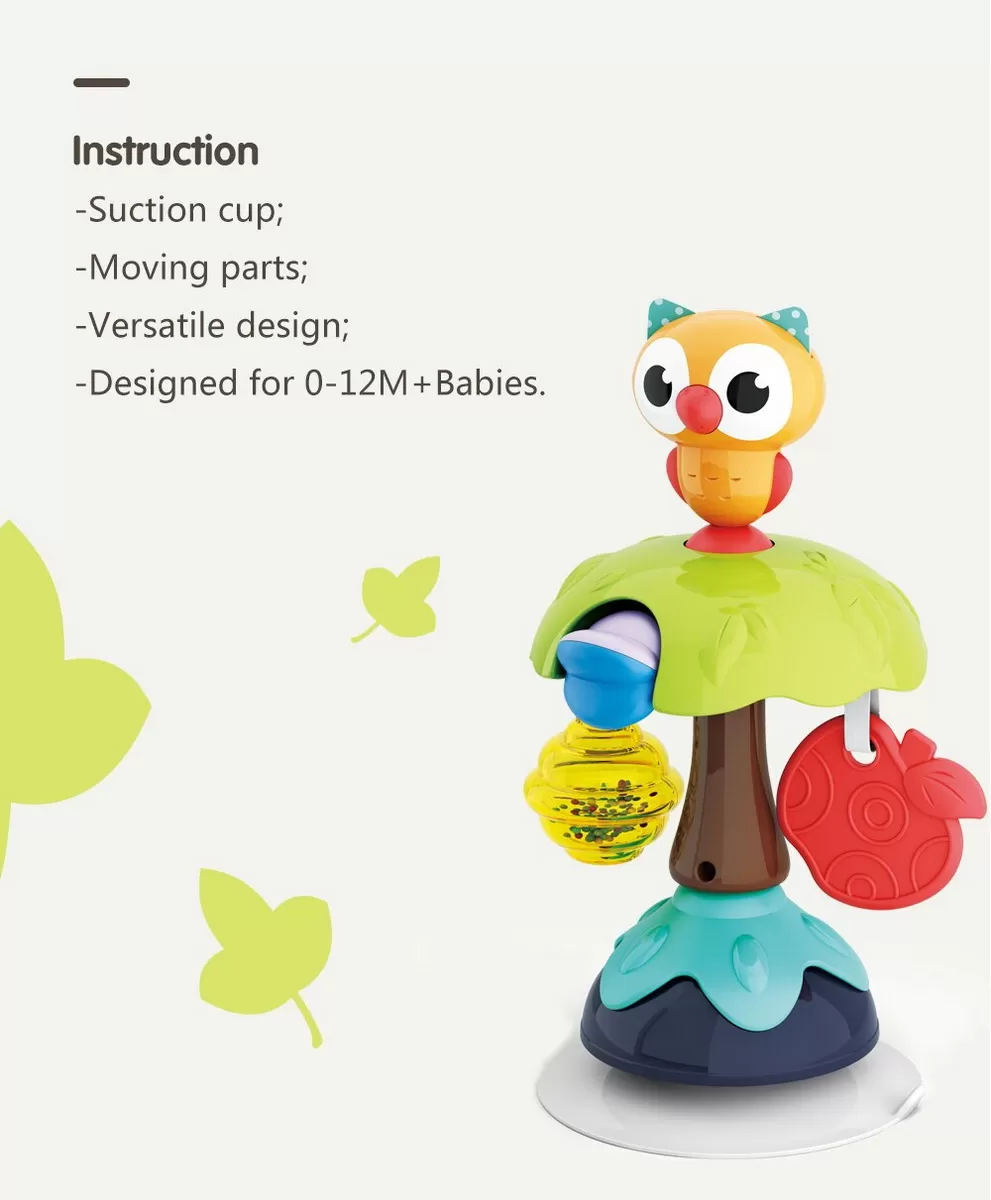 Jucaria bebe Bufnita cu ventuza are parti mobile, texturi variante, culori diferite pentru stimulare vizuala si un design versatil si atragator. Jucaria se poate monta masa copilului, pe scaunul lui de masa, pe parchet sau alte suprafete plane. Jucaria are 5 locuri, in care copilul poate efectua diferite activitatii precum rotirea, tragerea, apasarea, etc.