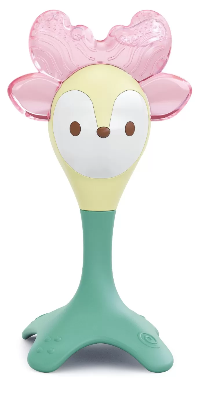 Jucaria in forma de caprioara poate sa fie racita in frigider pentru o calmare mai rapida a durerilor dentare. Are suprafata texturata. Forma speciala si culorile vii incurajeaza copilul sa exerseze si sa se joace, stimuland astfel dezvoltarea individuala. Nu contine bpa. Este confectionata din materiale sigure si durabile.