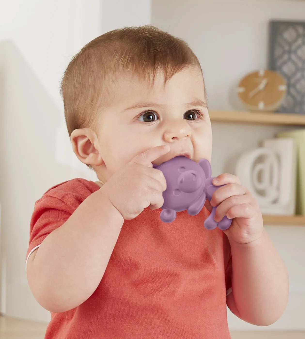 Jucarie de dentitie cu animale si inele flexibile special concepute pentru a prinde si rasuci manutele mici. Inele de dentitie fara BPA. Ajuta la imbunatatirea abilitatilor motorii fine si la dezvoltarea senzatiilor pentru bebelusii cu varsta de 3 luni si peste. Acest pachet contine jucaria de dentitie pentru bebelusi in forma de maimutica mov.