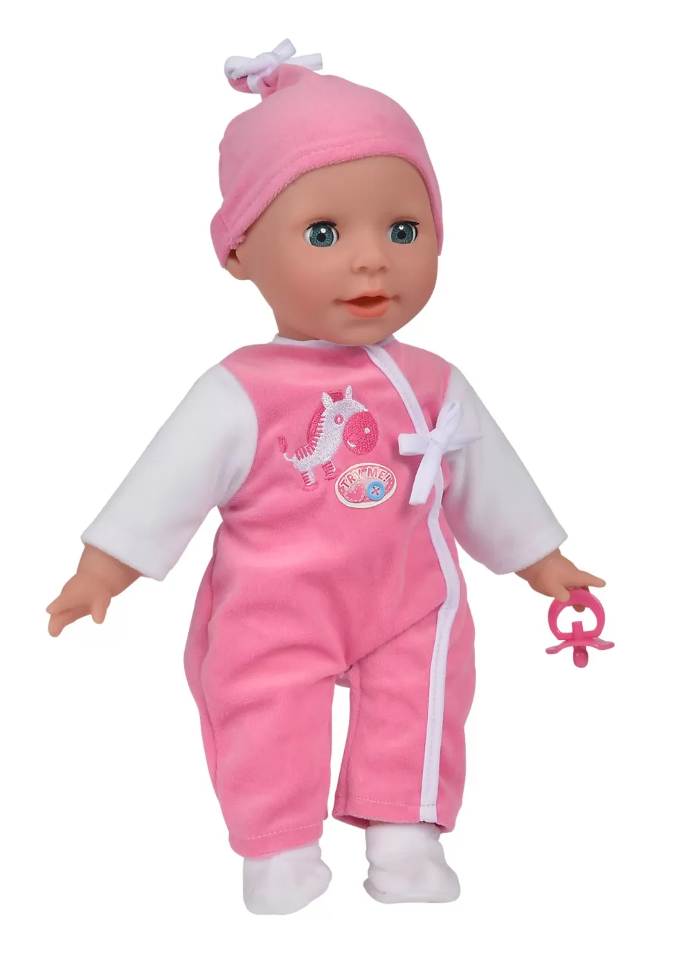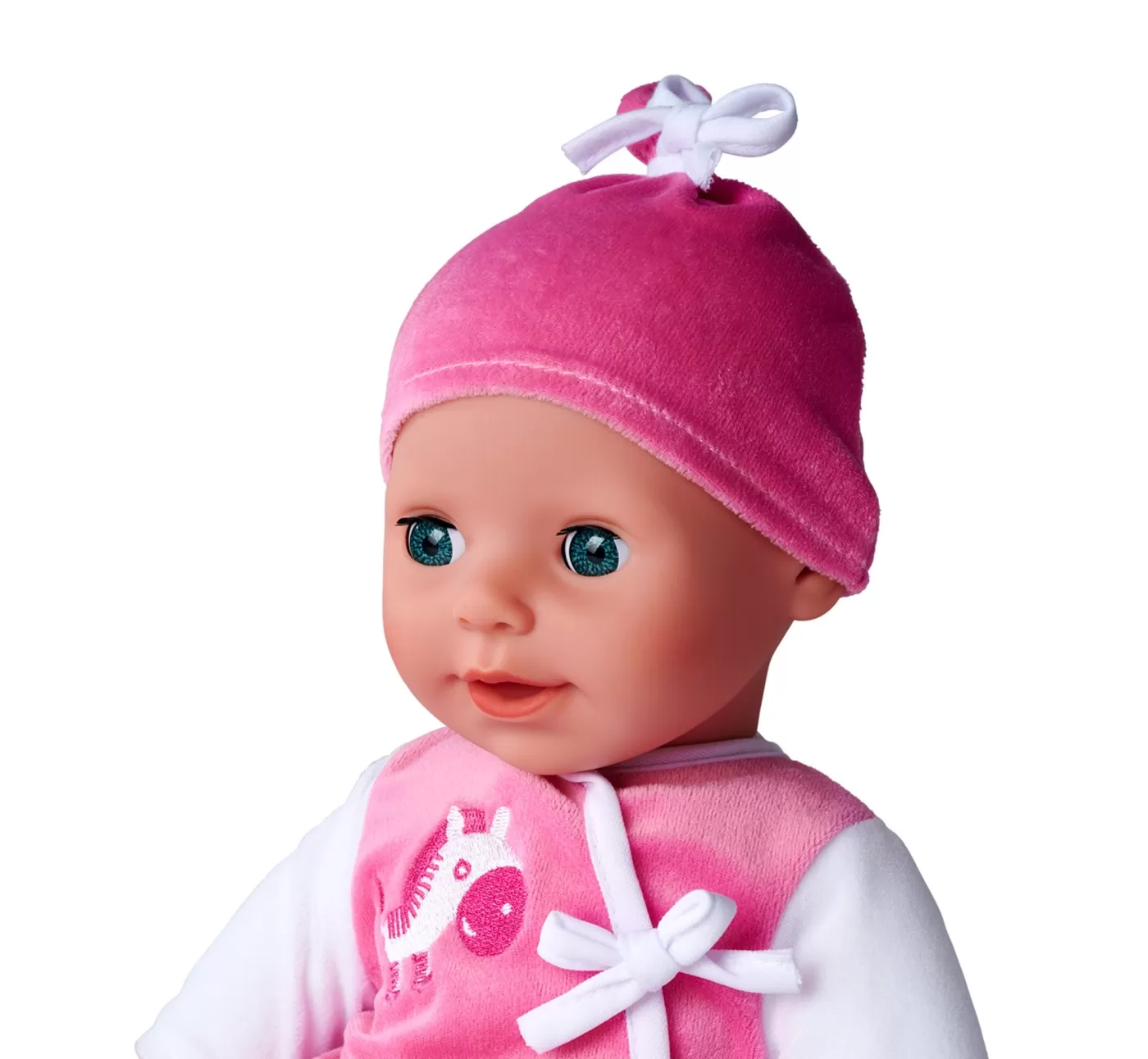 Micuta Laura este pregatita de joaca. Setul Laura Babbling contine papusa de corp moale de 38 cm cu suzeta si un biberon. Papusa poate reda 24 de sunete.