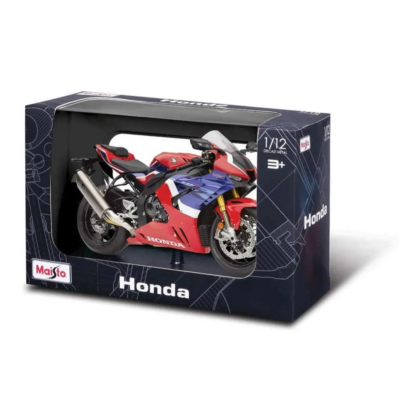 Motocicleta HONDA CBR 1000RR R FIREBLADE SP in miniatura la scara 112 este realizata din metal turnat si detalii din plastic de inalta calitate. Produsul reda cu fidelitate liniile sportive si elegante ale modelului original, fiind vopsit in rosu intens cu detalii albastre si alb si dotat cu elemente realiste precum sistemul de evacuare, suspensie si jantele sport. Aceasta replica este expusa intr-o cutie tip vitrina, ceea ce o face ideala atat pentru joaca, cat si pentru colectie. Recomandata copiilor de peste 3 ani, motocicleta Maisto HONDA combina rezistenta cu designul autentic, oferind o experienta deosebita celor pasionati de vehicule pe doua roti.