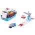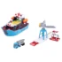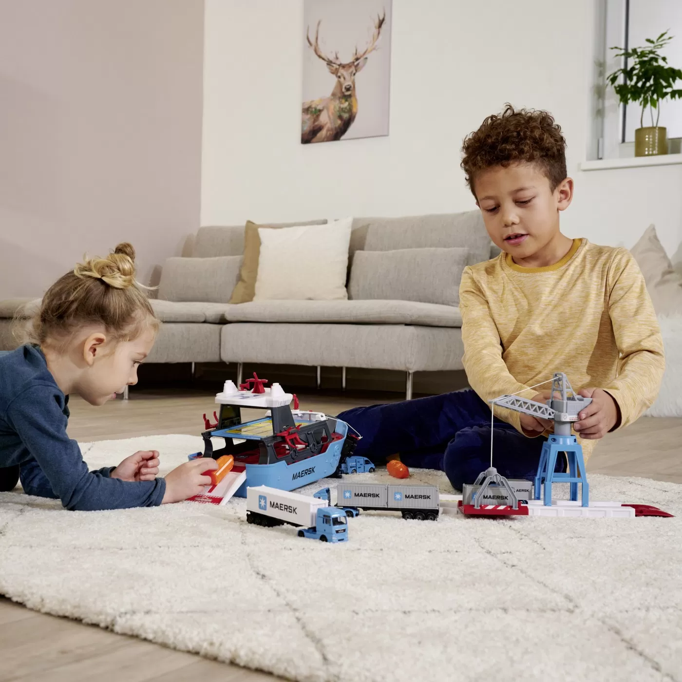 Statie portuara logistica Maersk (45x29x24 cm) cu nava de marfa, macara mobila si camion MAN cu container, pentru copii de la 5 ani. În cel mai scurt timp, camera copiilor se transforma intr-un port de transbordare in care copiii de la 5 ani in sus sunt ocupati sa descarce camioane si sa trimita marfurile peste mare cu o nava de marfa. Ca si in cazul unui cargo real, containerele si chiar masinile intregi sunt transportate pe nava cu macaraua controlabila manual sau prin rampa de incarcare pliabila. Încarcata cu masini sau cu jucaria ta preferata, conduceti barca prin cada. 2 barci de salvare cad in apa folosind functia de inclinare si sunt prinse din nou cu ajutorul unui troliu cu cablu.Pe langa nava si statia portuara cu macara mobila, setul extins de joaca contine si un model de masina Maersk din metal cu licenta oficiala un camion MAN TGX cu un container de 20 ft!