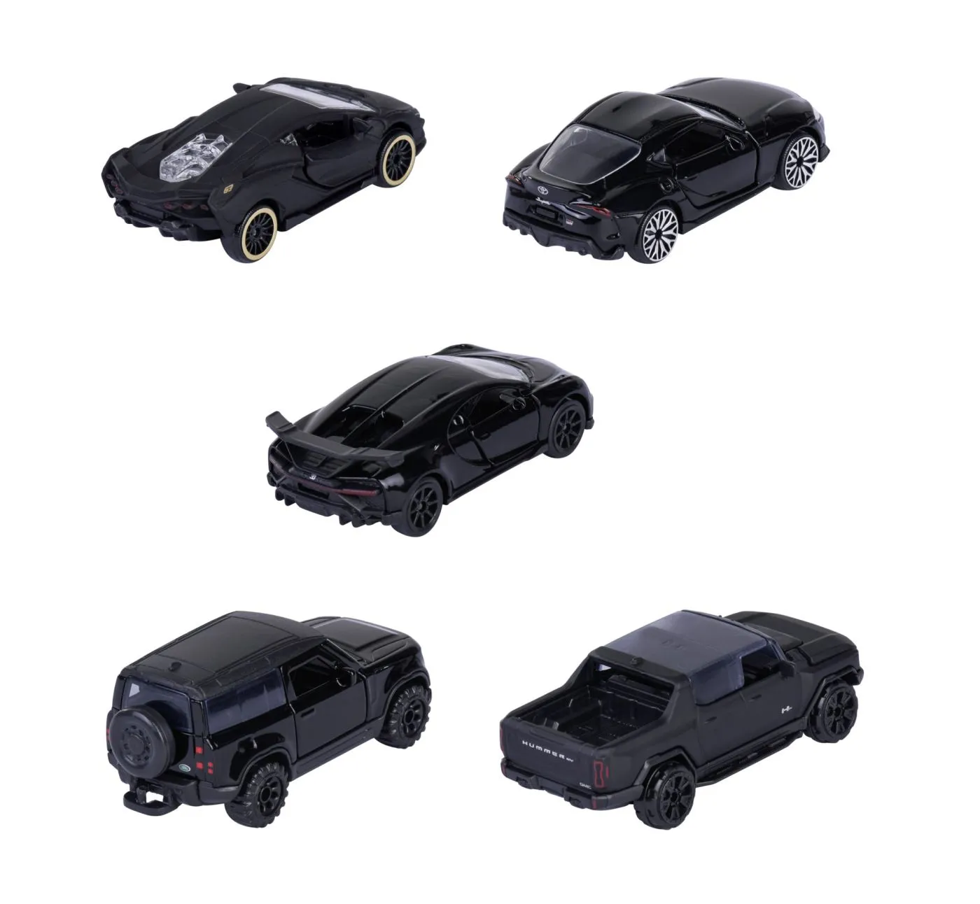 Majorette Car Set Black Edition (5 masini) – 5 masini model din metal negru cu roata libera, suspensie si deschidere, masini de jucarie pentru colectionari si copii de la 3 ani si peste, fiecare 7,5 cm. Setul cadou combina 5 masini metalice licentiate 1. Bugatti Chiron Pur Sport, 2. Lamborghini Sián FKP 37, 3. Toyota GR Supra, 4. Land Rover Defender 90 si 5. GMC Hummer EV.