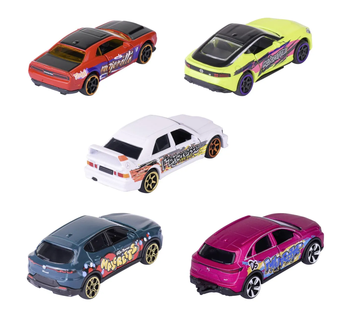 Set de masini Majorette Editie limitata 11 in aspect graffiti (5 masini) – 5 masini model metalic cu roata libera, suspensie si portiune de deschidere, masini de jucarie pentru colectionari si copii de la 3 ani si peste, 7,5 cm fiecare. Puterea se intalneste cu stilul – urban, atragator si inconfundabil acest set de masini Majorette combina 5 vehicule clasice cu licenta intr-un design graffiti individual – cu culori stralucitoare si etichete cool! Setul cadou contine 3 modele premium ale Editiei limitate 11 (Dodge Challenger SRT Demon, Mercedes-Benz 190E 2.5-16 Evo II si Alfa Romeo Tonale) precum si 2 masini speciale, ce pot fi gasite doar in acest set Nissan Z in galben neon si DS7 E-Tense in roz – desigur si cu graffiti!