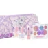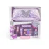 Include 2 lacuri de unghii cu sclipici, un balsam de buze cu aroma de struguri, un ruj, o paleta cu 6 farduri de ochi si aplicator, o pila de unghii, o elastic spiralata pentru par si un penar cu un fluturas cu sclipici.