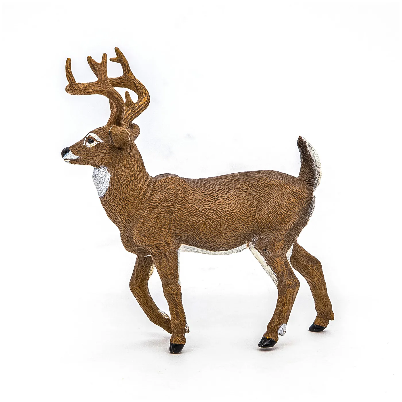 Vizitati cerbul cu coada alba maiestuoasa in inima padurilor, explorati savana alaturi de puternicul tigru de Sumatra sau urcati pe varfuri acoperite de zapada pentru a cauta leopardul de zapada. Cerbii cu coada alba sunt mamifere, raspandite predomimant pe teritoriul Americii de Nord si Centrale. Sunt intalnite in special in zone impadurite, putand sa se fereasca de pradatori prin coloritul lor neutru. Cerbii cu coada alba sunt animale sperioase, mereu alerte, acestea isi ridica cozile albe in aer in caz de pericol. Cerbii cu coada alba, sunt vanati pentru coarnele lor, acestea fiind expuse ca trofee valoroase. Produsul are urmatoarele dimensiuni 10.4 x 4 x 10.9cm si este recomandat copiilor cu varsta peste 3 ani. De mai bine de 20 de ani, Papo inoveaza constant si ii face pe copii din intreaga lume sa viseze cu o gama bogata de peste 600 de produse, reprezentand 12 lumi, animale si personaje. De la modelul original la serie, fiecare dintre figurinele Papo a fost conceputa si creata in Franta pentru a fi fabricata intr-o permanenta preocupare pentru calitate. Pictate manual, atentia la detalii este acum recunoscuta. Figurinele Papo se disting prin acuratete si realism, detaliile sunt de asa natura incat am putea crede ca se vor pune in miscare.