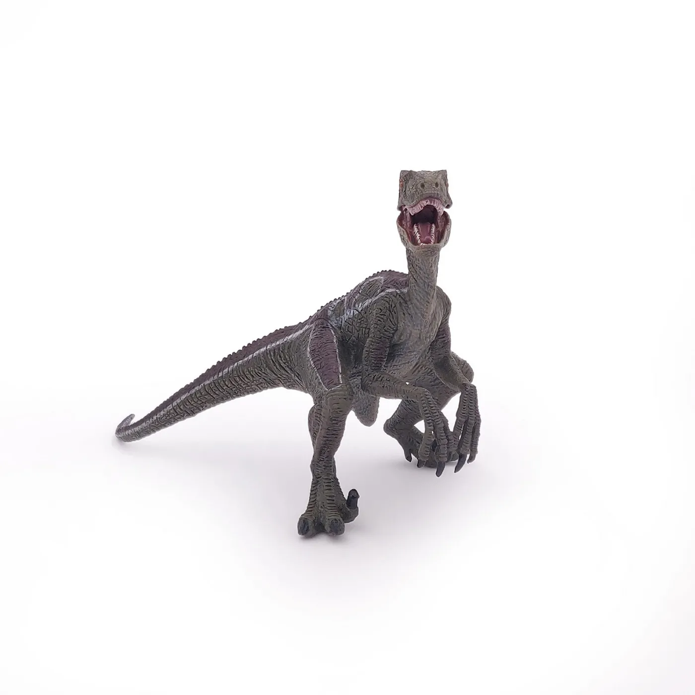 Cu dinozauri, calcati pamantul jurasic, intalniti legendarul T-Rex, plimbati-va prin campii vaste cu velociraptorul sau zburati cu un pteranodon. Velociraptorul a fost un dinozaur carnivor foarte agil si rapid care a trait pe teritoriul unde se afla Mongolia de azi, in era Mezozoica, in Cretacicul superior, in urma cu 75-71 milioane de ani. Velociraptorul a fost un animal de inaltime medie, avand o lungime de 2m, o inaltime de 0.5m si o greutate de doar 15-20 kg. Se spune cu certitudine ca ar fi fost unu dintre cei mai rapizi dinozauri atingand viteza de 60km/h pe distante scurte. Pentru a-si ucide victimele isi folosea gheara lunga de 9 cm care aparea la al doilea deget de la fiecare picior. Celelelalte degete de la membrele posterioare erau groase si prezentau si ele gheare ascutite si tari, dar mai mici. Produsul are urmatoarele dimensiuni 9.8 x 7 x 9.5cm si este recomandat copiilor cu varsta peste 3 ani. De mai bine de 20 de ani, Papo inoveaza constant si ii face pe copii din intreaga lume sa viseze cu o gama bogata de peste 600 de produse, reprezentand 12 lumi, animale si personaje. De la modelul original la serie, fiecare dintre figurinele Papo a fost conceputa si creata in Franta pentru a fi fabricata intr-o permanenta preocupare pentru calitate. Pictate manual, atentia la detalii este acum recunoscuta. Figurinele Papo se disting prin acuratete si realism, detaliile sunt de asa natura incat am putea crede ca se vor pune in miscare.