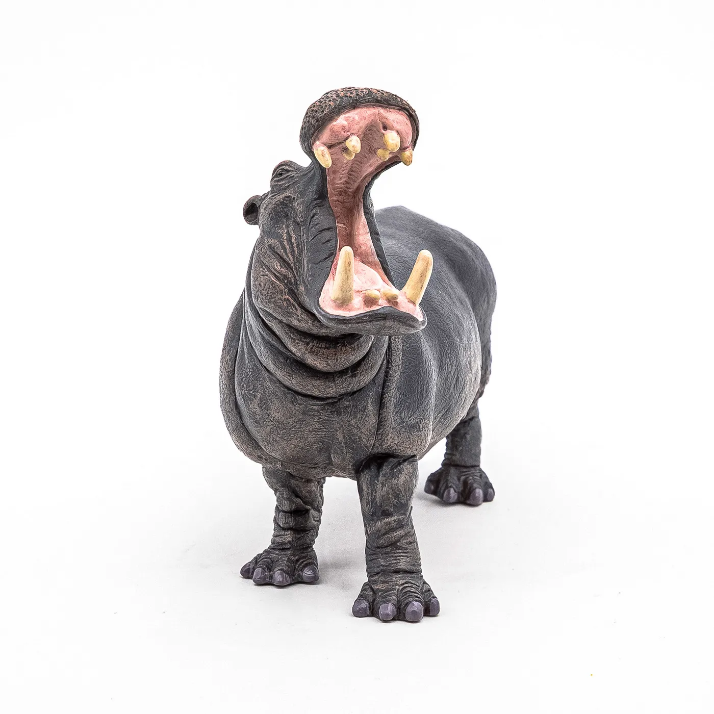 Vizitati cerbul cu coada alba maiestuoasa in inima padurilor, explorati savana alaturi de puternicul tigru de Sumatra sau urcati pe varfuri acoperite de zapada pentru a cauta leopardul de zapada. Chiar si crocodilii se feresc de acest mastodont de 3 tone cu canini impresionanti. Acest animal semi-acvatic traieste de-a lungul raurilor din Africa si isi petrece zilele scufundat in apa pentru a lupta impotriva caldurii. Abia dupa lasarea intunericului ajunge pe continent pentru a manca iarba proaspata (pana la 40 kg pe zi). Hipopotamul este usor de recunoscut! Are o silueta masiva, urechi mici, picioare scurte si o gura uriasa cu dinti impresionanti. Hipopotamii traiesc in grupuri de aproximativ cincisprezece indivizi respectand o ierarhie stricta. Produsul are urmatoarele dimensiuni 14 x 5 x 11cm si este recomandat copiilor cu varsta peste 3 ani. De mai bine de 20 de ani, Papo inoveaza constant si ii face pe copii din intreaga lume sa viseze cu o gama bogata de peste 600 de produse, reprezentand 12 lumi, animale si personaje. De la modelul original la serie, fiecare dintre figurinele Papo a fost conceputa si creata in Franta pentru a fi fabricata intr-o permanenta preocupare pentru calitate. Pictate manual, atentia la detalii este acum recunoscuta. Figurinele Papo se disting prin acuratete si realism, detaliile sunt de asa natura incat am putea crede ca se vor pune in miscare.