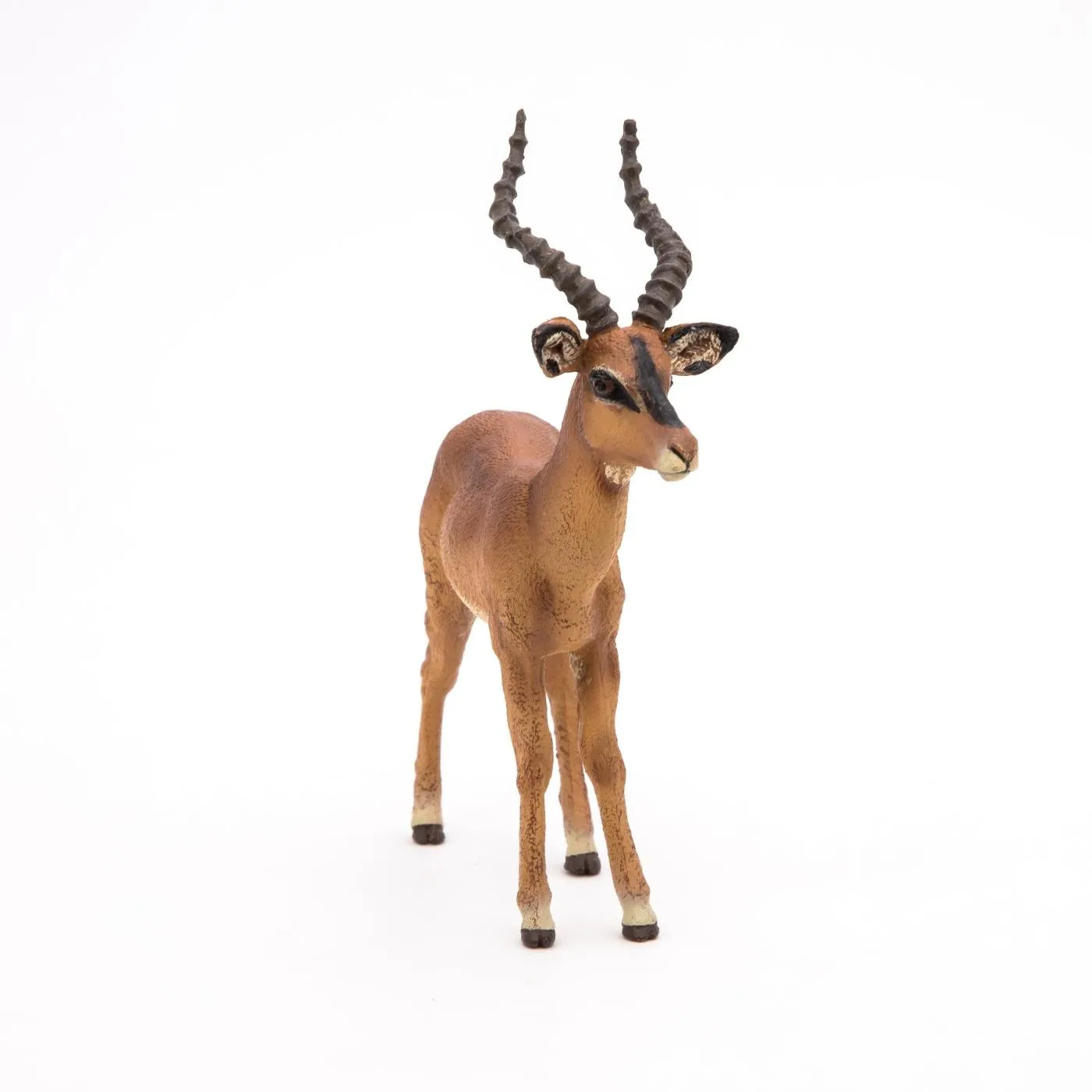 Vizitati cerbul cu coada alba maiestuoasa in inima padurilor, explorati savana alaturi de puternicul tigru de Sumatra sau urcati pe varfuri acoperite de zapada pentru a cauta leopardul de zapada. stiti cum se recunosc impalalele? Au trei linii negre, unice pentru fiecare, in varful urechilor, pe spatele cozii, pe partea superioara a coapselor si pe frunte. Ele sunt chiar numite &bdquo111&rdquo in Kenya de catre trackeri din cauza acestor 3 linii negre vizibile din spate. Impalas fac parte din familia bovideelor, mai precis antilopele, arata ca niste cobi, gazele si cerbi, masoara in general intre 1,10 m si 1,50 m lungime. Se gaseste in principal in estul Africii centrale si de sud. Produsul are urmatoarele dimensiuni 8.5 x 11 x 3cm si este recomandat copiilor cu varsta peste 3 ani. De mai bine de 20 de ani, Papo inoveaza constant si ii face pe copii din intreaga lume sa viseze cu o gama bogata de peste 600 de produse, reprezentand 12 lumi, animale si personaje. De la modelul original la serie, fiecare dintre figurinele Papo a fost conceputa si creata in Franta pentru a fi fabricata intr-o permanenta preocupare pentru calitate. Pictate manual, atentia la detalii este acum recunoscuta. Figurinele Papo se disting prin acuratete si realism, detaliile sunt de asa natura incat am putea crede ca se vor pune in miscare.