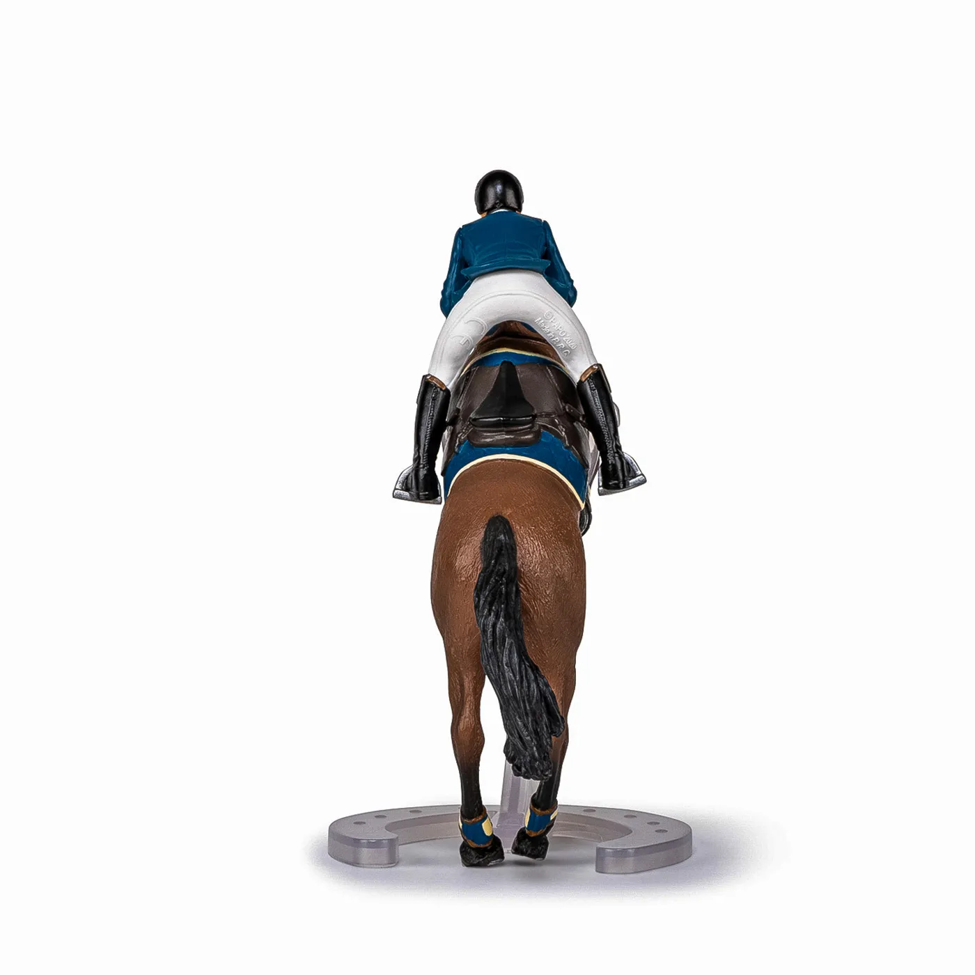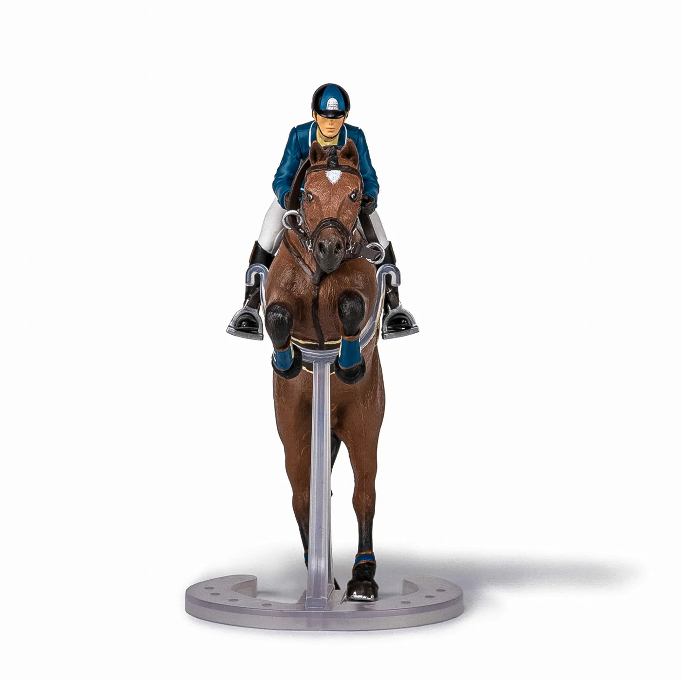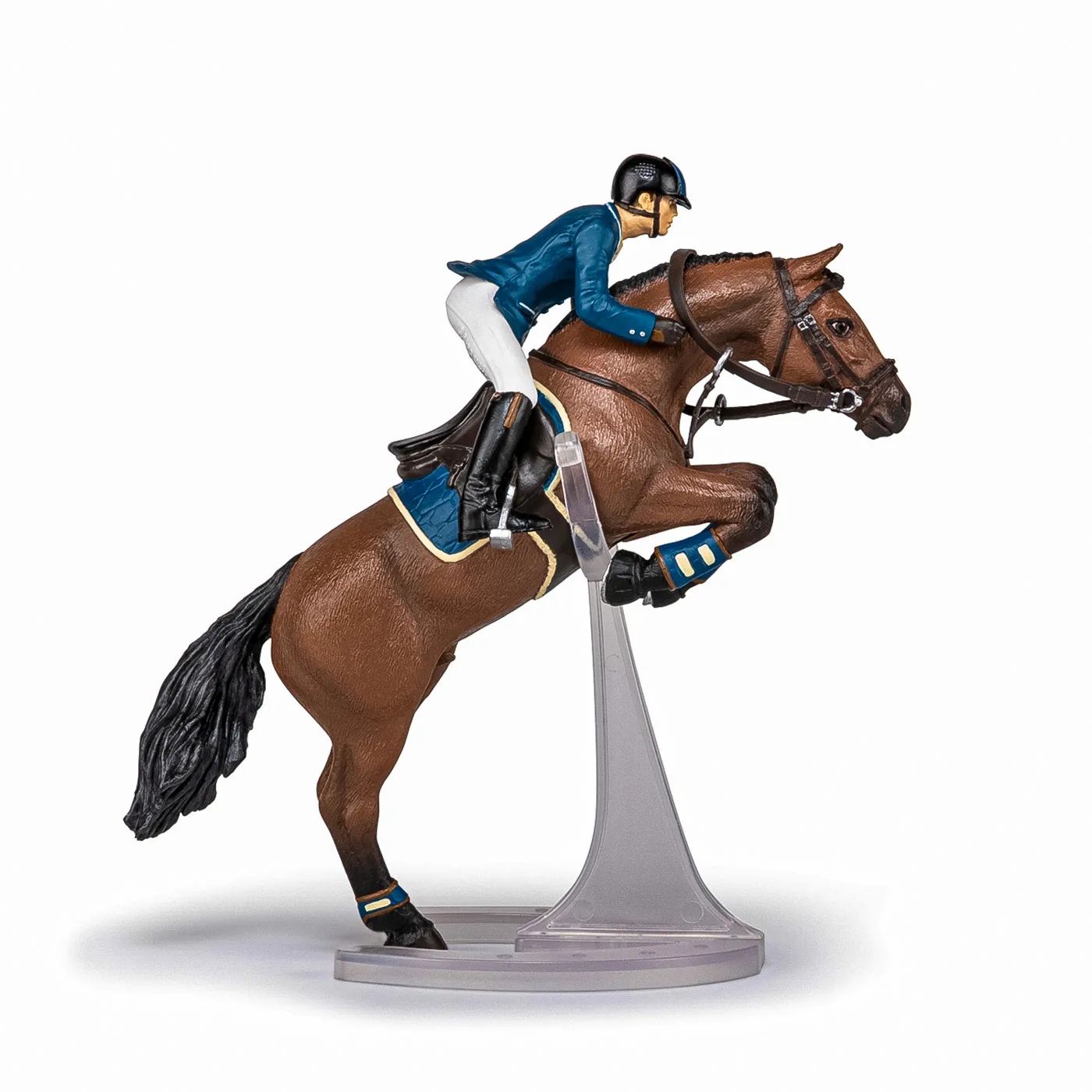 Faceti o plimbare prin campuri cu ecvinele Papo, participati la concursuri de sarituri sau chiar la cursuri de dresaj. Tensiunea este la maxim pe traseul de sarituri, tanarul calaret insotita de calul ei se pregateste sa treaca de ultimul obstacol care ii desparte de victorie. Regula este simpla, pentru a castiga este necesar ca impreuna sa o treaca fara sa o rastoarne. Produsul are urmatoarele dimensiuni 16 x 10 x 19cm si este recomandat copiilor cu varsta peste 3 ani. De mai bine de 20 de ani, Papo inoveaza constant si ii face pe copii din intreaga lume sa viseze cu o gama bogata de peste 600 de produse, reprezentand 12 lumi, animale si personaje. De la modelul original la serie, fiecare dintre figurinele Papo a fost conceputa si creata in Franta pentru a fi fabricata intr-o permanenta preocupare pentru calitate. Pictate manual, atentia la detalii este acum recunoscuta. Figurinele Papo se disting prin acuratete si realism, detaliile sunt de asa natura incat am putea crede ca se vor pune in miscare.