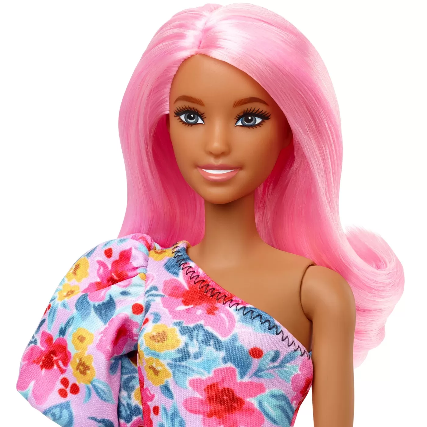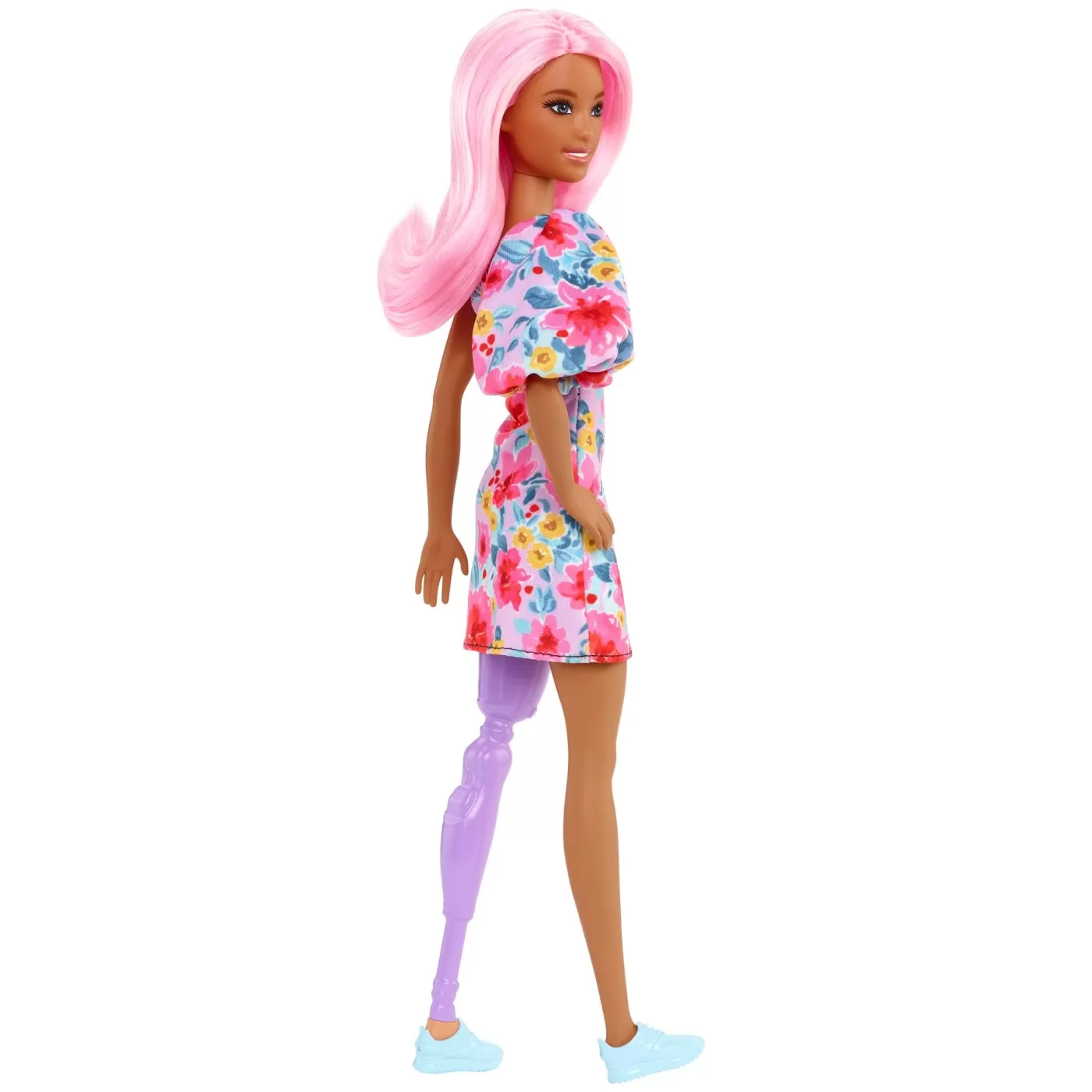 Fashionistas este una dintre cele mai indragite colectii Barbie, oferind o gama larga de papusi cu diferite stiluri si accesorii, introducand conceptul de diversitate si acceptare in randul fetelor. Aceasta colectie include papusi cu diferite tipuri de siluete, tonuri de piele, culori de ochi si par, astfel fetele nu se vor plictisi niciodata si isi vor gasi papusa asemanatoare stilului lor. Papusile au stilul lor propriu, inspirat de ultimele tendinte din moda si vin cu o tinuta completa, incaltaminte si accesorii fabuloase. Hainutele sunt confectionate astfel incat se pot potrivi oricarei papusi din gama Fashionistas. Descopera fiecare papusa Barbie din colectia Barbie Fashionistas si exploreaza lumea minunata a modei! Papusa cu par roz este imbracata intr-o rochie cu imprimeu floral si are o pereche de ochelari de soare. Are un picior protetic si o pereche de adidasi blue.