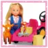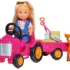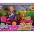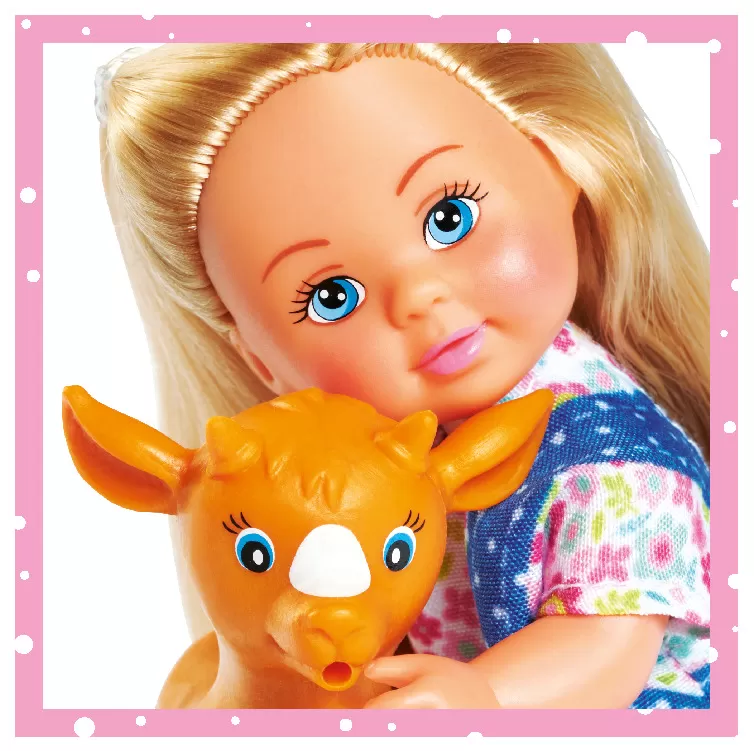 Papusa Evi este acum la ferma. Evi a iesit pe camp cu tractorul ei cu remorca si animalutul ei preferat. Setul contine si un balot de fan, lopata si furca. Inaltime papausa 12 cm