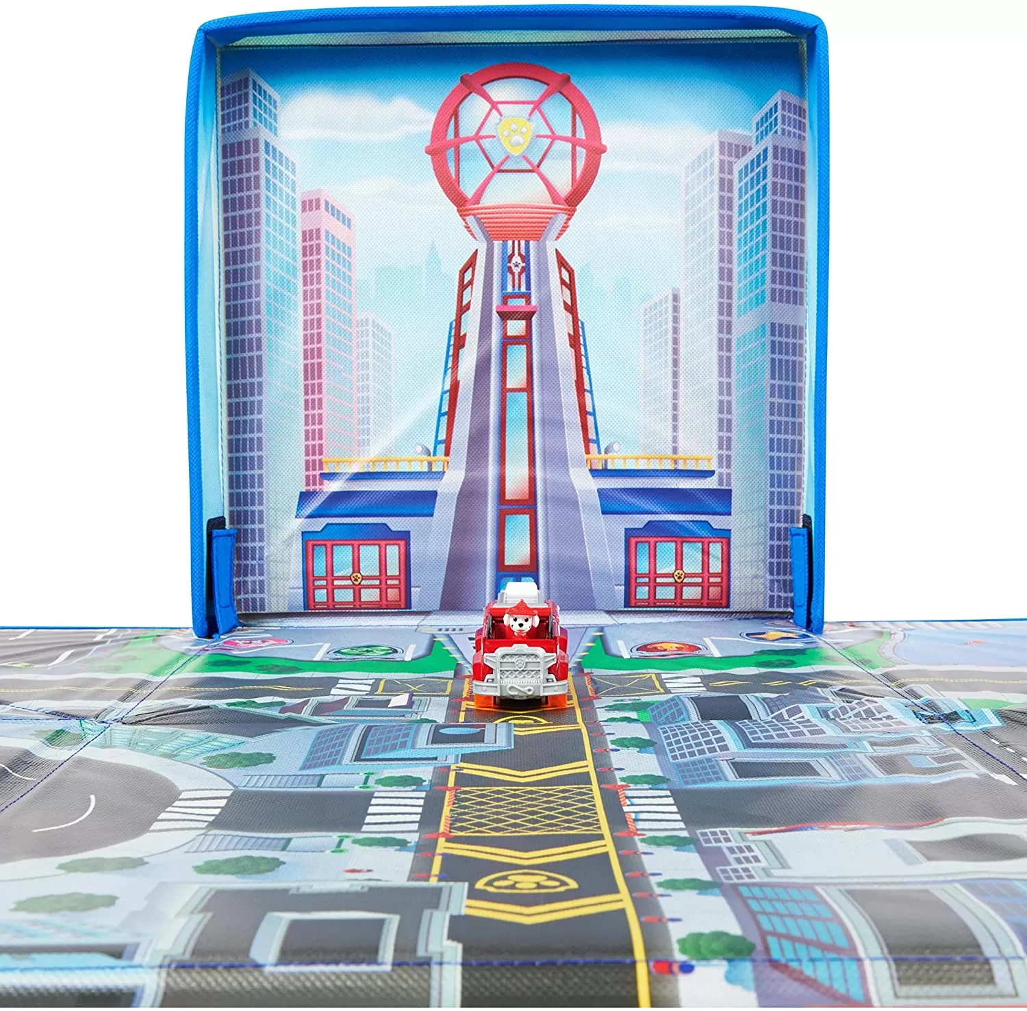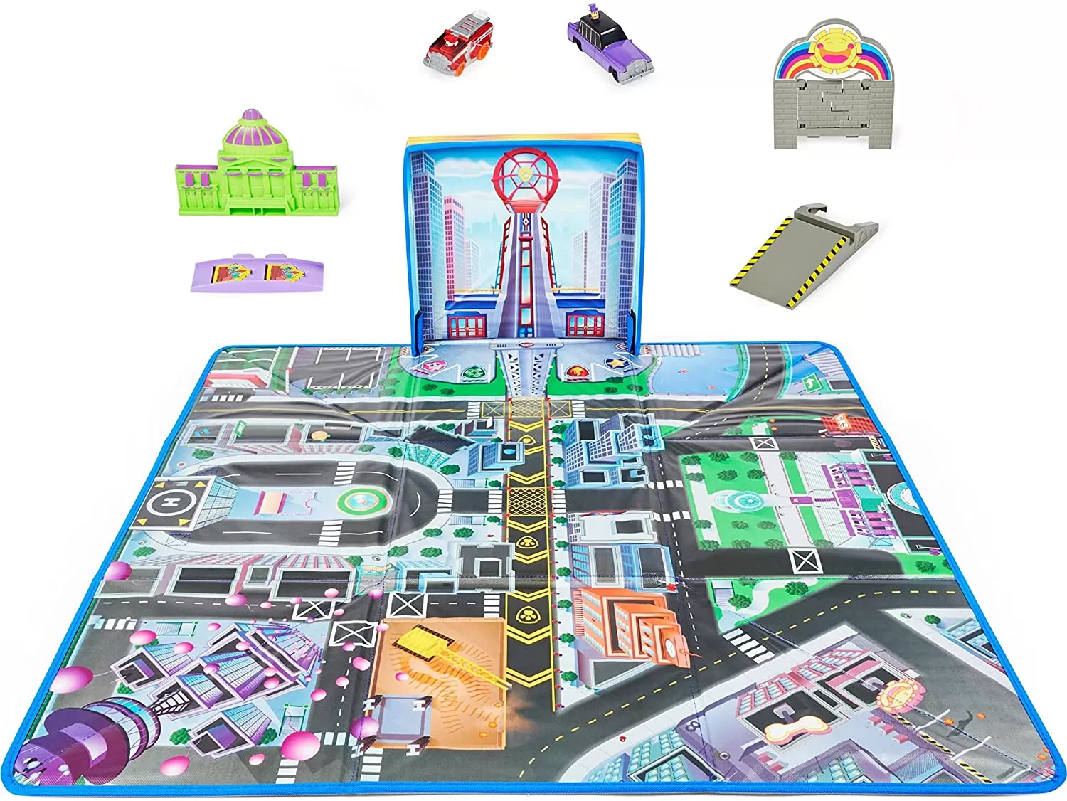 Pune in scena misiunile de salvare in mare viteza Patrula Catelusilor True Metal pe covorul tematic Golful Aventurii! Acest set exclusiv de joaca include vehiculele True Metal la scala 155 a lui Marshall si a Primarului Humdinger pe care nu le vei gasi altundeva, doua accesorii pentru joc si un covor de joaca tematic Patrula Catelusilor care atunci cand se ruleaza devine o cutie de depozitare pentru jucarii. Asaza covorul si jucariile in orice camera iar apoi foloseste-ti imaginatia pentru a-ti inventa propriile aventuri! Harta Golfului Aventurii de pe covor va adauga o noua dimensiune aventurilor tale alaturi de vehiculele tale din metal turnat. &Icircmpinge masinile pe strazile orasului pentru a-l ajuta pe Marshall sa salveze Primaria! Rostogoleste-te peste rampa pentru a stinge incendiul. Nu-l lasa pe Primarul Humdinger sa scape creeaza-ti propria scena de urmarire dintre Marshall si Primarul care fuge in limuzina lui, apoi ajuta-l pe Marshall sa darame peretele scolii. Dupa ce ai terminat jocul, ruleaza covorul pentru a forma o cutie de depozitare perfecta pentru vehiculele si accesoriile din set si alte vehicule True Metal (vandute separat). Covorul tematic Patrula Catelusilor si toate jucariile pentru baieti si fete din filmul patrula Catelusilor sunt cadouri minunate pentru copii si fanii Patrulei. Covorul are dimensiunile de 29 cm x 29 cm. Pentru si mai multa distractie inspirata din filmul Patrula Catelusilor cauta vehiculele True Metal din film la scara 155 si Setul de Salvare Total City (fiecare vandute separat). Creeaza-ti propriile tale misiuni de salvare la fel ca in filmul Patrula Catelusilor cu ajutorul covorului tematic Golful Aventurii!