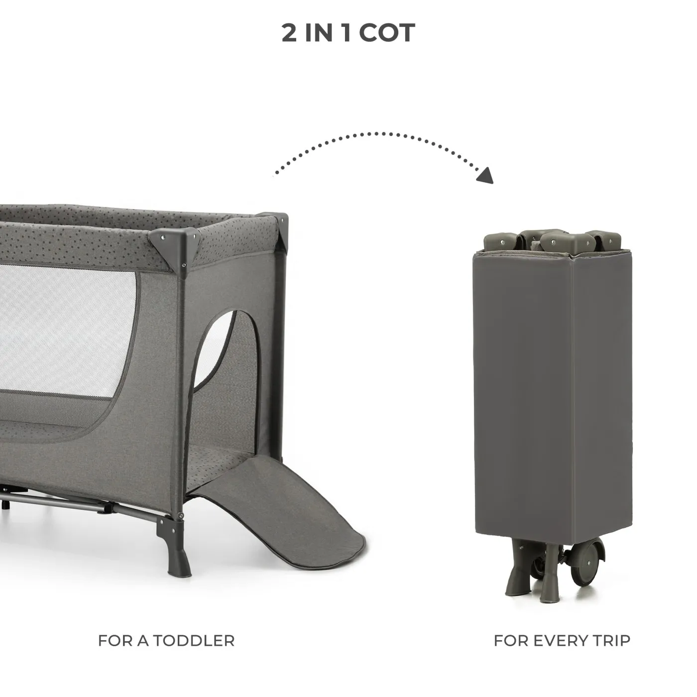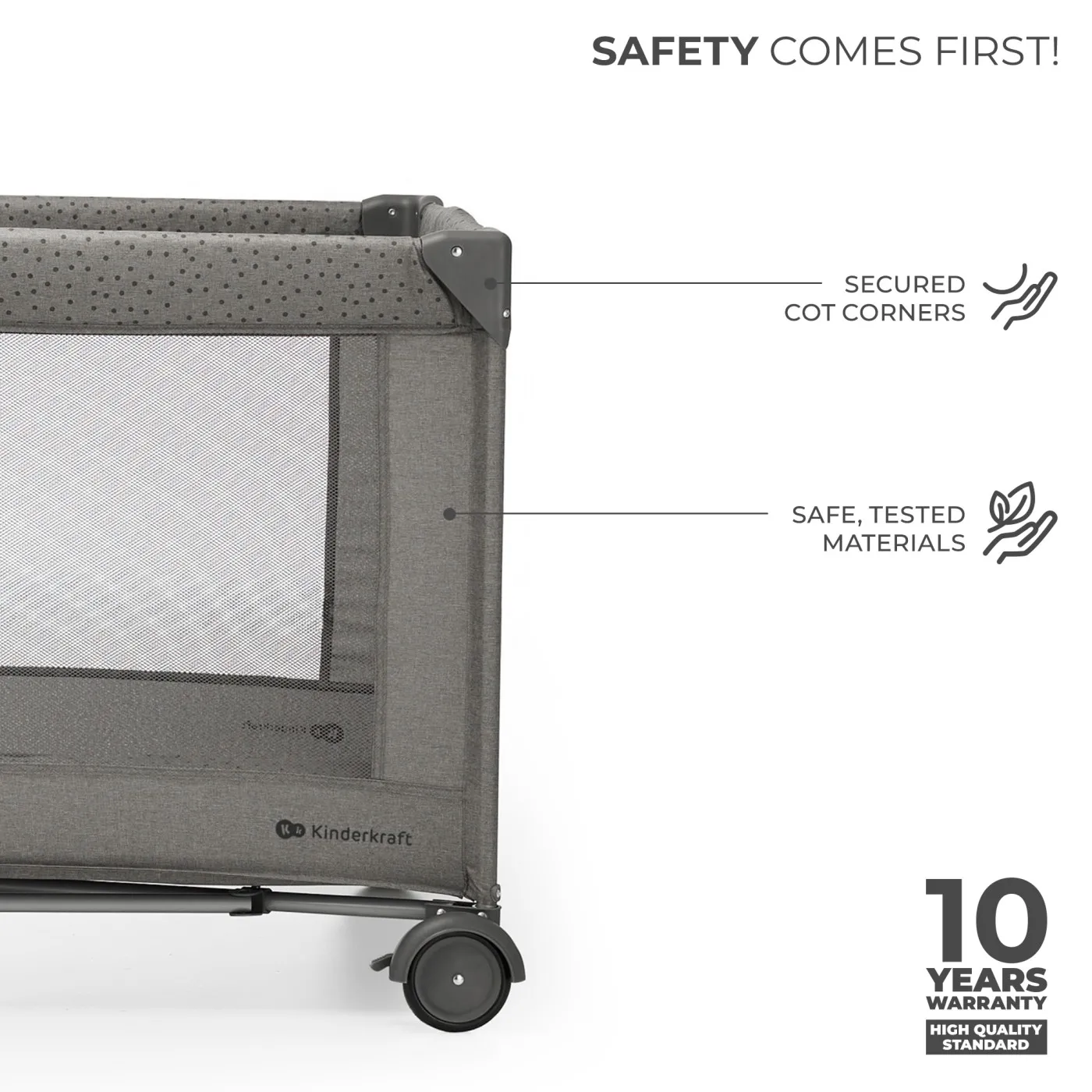 Patut pentru calatorie 2 in 1 Kinderkraft JOY 2, DARK GREY JOY 2 DARK GREY este un patut pliabil, care a fost creat cu gandul la parintii carora le plac solutiile multifunctionale. JOY 2 DARK GREY este un patut 2 in 1 pentru copii. Datorita designului sau suplu si culorilor universale va deveni rapid piesa de mobilier preferata din casa voastra. JOY 2 DARK GREY se pliaza la dimensiuni compacte in numai 5 secunde. Acest patut este foarte usor, dar in acelasi timp si foarte rezistent. Are de asemenea o geanta comoda cu maner, ideala in calatorii. JOY 2 DARK GREY este perfect si pentru utilizarea zilnica acasa. Are o intrare laterala inchisa cu un fermoar care este ideala pentru copiii ce merg de-a busilea. JOY 2 DARK GREY este solutia perfecta pentru fiecare casa – se regaseste in orice spatiu, iar atunci cand este nevoie se pliaza usor pentru depozitarea in dulap. Patut 2 in 1 JOY 2 DARK GREY este un singur patut, dar care indeplineste 2 functii patut pentru copiii mai mari si patut de calatorie. Patutul are iesirea in lateral, inchisa cu fermoar pentru ca cei mici sa poata intra si iesi singuri din locul de joaca. Patutul ideal pentru calatorii JOY 2 DARK GREY se pliaza la dimensiuni compacte in numai 5 secunde. &Icircncape cu usurinta in portbagajul masinii, chiar si atunci cand aveti bagaje mari. Patutul vine impreuna cu o geanta de calatorie cu maner astfel iti va fi usor sa iei patutul intr-o mana si sa urci scarile. Dimensiunile reduse de dupa pliere fac depozitarea lui JOY 2 DARK GREY in casa mai usoara. &Icircn casa si afara JOY 2 DARK GREY poate fi utilizat si in exterior, ca de exemplu pe balcon sau terasa. Peretii din plasa fac posibila observarea continua a copilului si ii asigura in acelasi timp celui mic circulatia optima a aerului in zilele calde. JOY 2 DARK GREY este dotat si cu doua roti care te ajuta atunci cand muti patutul dintr-o camera in alta. &Icircl vei putea vedea mereu pe copil. Material sigur JOY 2 DARK GREY este un patut sigur, construit din materiale testate si placute la atingere. &Icircn plus, colturile patutului sunt protejate. Materialul patutului se curata in doar cateva clipe cu o carpa umeda, iar un mare avantaj este timpul scurt necesar pentru uscare. &Icircn plus, nu se increteste chiar daca pliezi si depliezi patutul frecvent. JOY 2 DARK GREY va arata mereu elegant. Se potriveste fiecarui interior JOY 2 DARK GREY are culori frumoase si universale, care se asorteaza aproape fiecarei incaperi. Patutul are o constructie usoara si supla, care il face perfect in sufragerie, dormitor sau camera copilului.