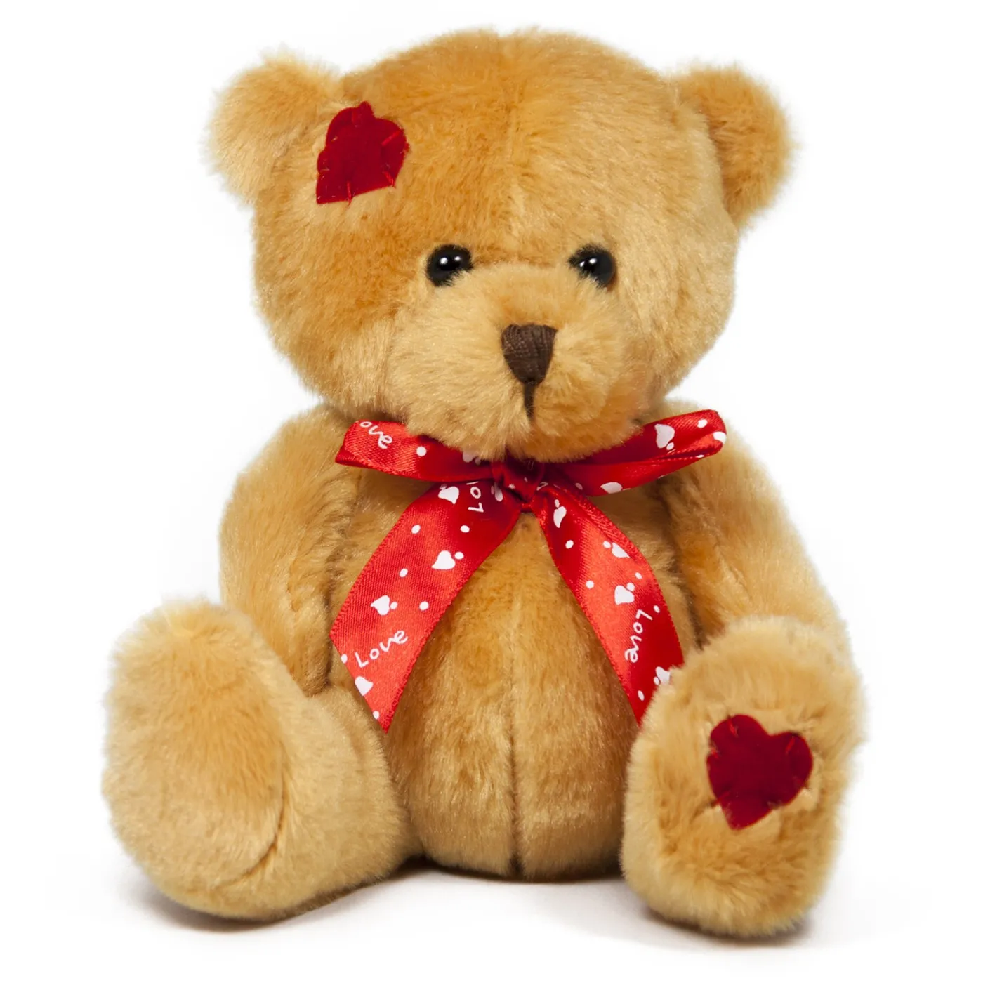 Un ursulet de plus maro-auriu, cu o blanita moale si pufoasa, sta asezat intr-o pozitie prietenoasa, parca invitand la o imbratisare. Ochii negri, mici si stralucitori, impreuna cu nasul maro inchis, brodat in forma de inimioara, ii confera o expresie dulce si inocenta. O funda rosie aprinsa, cu mici buline albe si cuvantul Love scris in alb de mai multe ori, ii inconjoara gatul, adaugand o nota vibranta de culoare si un mesaj clar de afectiune. Doua petice rosii in forma de inima, unul aplicat pe urechea stanga si celalalt pe piciorul drept, completeaza designul adorabil si subliniaza tema dragostei. Umplutura moale si pufoasa il face perfect pentru a fi imbratisat si alintat.