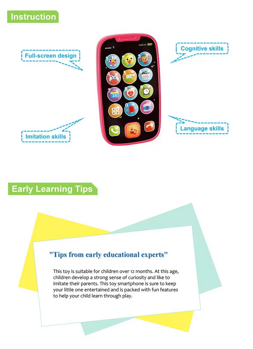 In aceasta perioada, copiii sunt foarte interesati de aproape orice dar mai ales sa isi imite parintii. Un smartphone de jucarie va va distra copilul cu butoane, melodii si dialoguri de divertisment in limba engleza. Butonul mare de mai jos, cu imaginea de note, reda 8 melodii diferite pentru a alege din acompaniament usor. Copilul poate apasa butoanele cu imagini de animale si isi aminteste ce sunete fac.