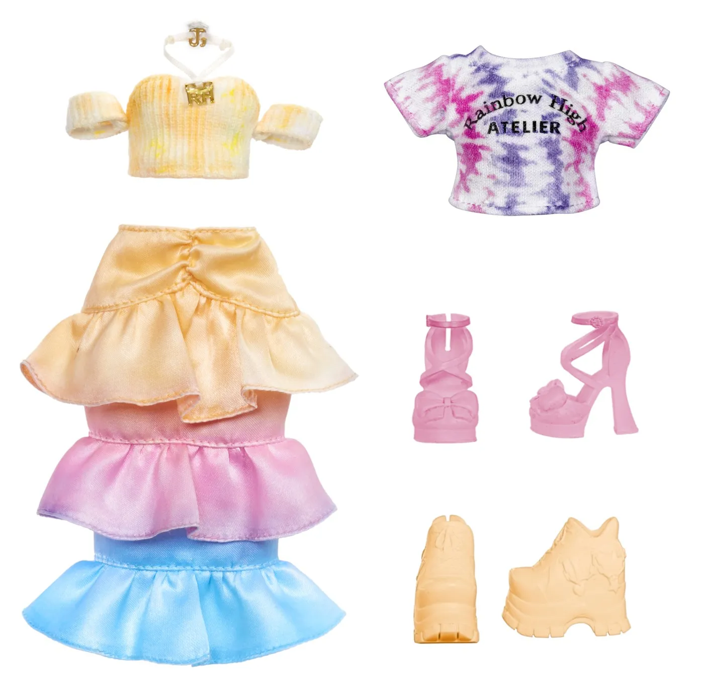 Rainbow High Watercolor & Create face extrem de usor sa-ti creezi propria papusa personalizata Rainbow High in multe moduri diferite, inclusiv cu Tie-Dye! Poti folosi acuarelele lavabile si pe propriul par! Apoi, doar clateste si repeta pentru a crea din nou.Adauga apa in cele 6 pulberi colorate pentru a crea acuarele, apoi coloreaza hainele si parul. Include 6 culori (roz, portocaliu, galben, verde, albastru si violet) pentru a face atat de multe desene colorate. Este atat de simplu!Pentru desene precise, aplica acuarelele folosind buretele cu doua capete direct pe haine si par. Atatea moduri de a te distra!Include elastice pentru a crea modele amuzante de tie-dye – spirale, straturi si multe altele.Sabloanele fac usor sa creezi forme amuzante pe par si haine.In plus, fata de papusa imbracata intr-o tinuta alba (bluza alba, fusta alba si pantofi albi), primesti si un tricou si pantofi bonus.Este atat de usor sa repeti procesul. Pur si simplu spala cu apa si sapun, lasa sa se usuce si incepe din nou sa creezi!Coloreaza-ti si tu parul! Doar aplica pe suvite pentru a adauga culoare parului tau. Nota culoarea va fi mai vibranta pe parul mai deschis!Papusa Watercolor & Create are par lung cu bucle si o codita impletita, gene lungi si ochi din sticla. Colectioneaza intreaga gama de papusi Watercolor & Create.Este inclusa 1 papusa exclusiva cu o tinuta complet alba si incaltaminte pentru papusa plus tricou si pantofi bonus, 6 acuarele lavabile colorate, burete cu doua capete, elastice, sablon, pahar de masurare, bol de unica folosinta, lingura si pieptene.Fiind complet articulata, este super distractiva si usor de personalizat. Capul, bratele, mainile si picioarele se indoaie pentru multe pozitii amuzante, inclusiv spagatul! Sau o poti expune pe suportul inclus pentru papusa.
