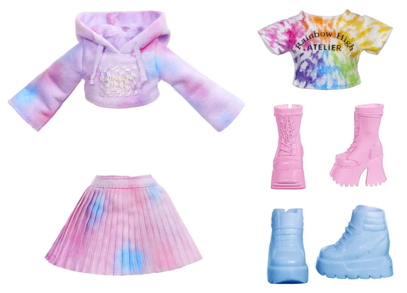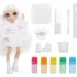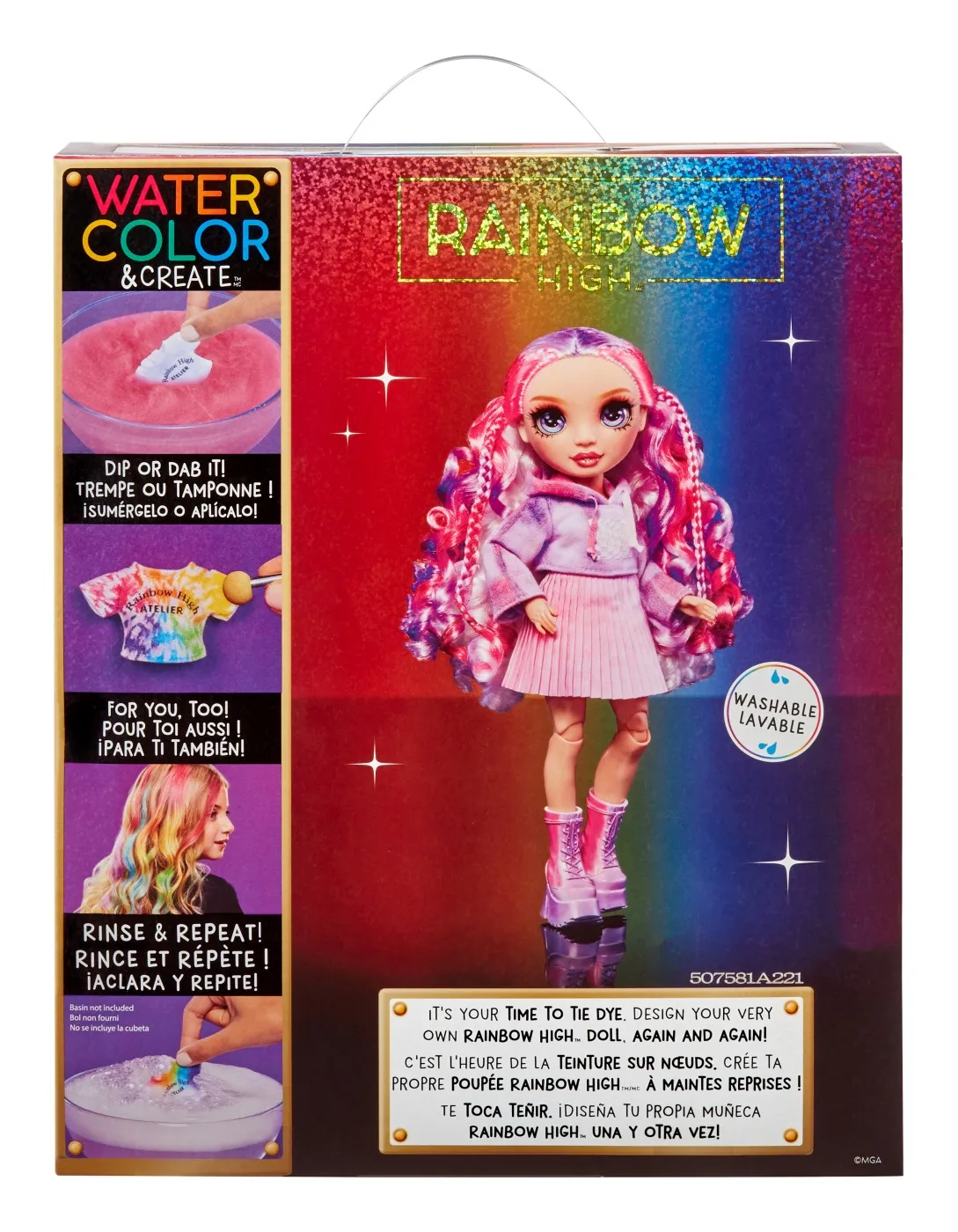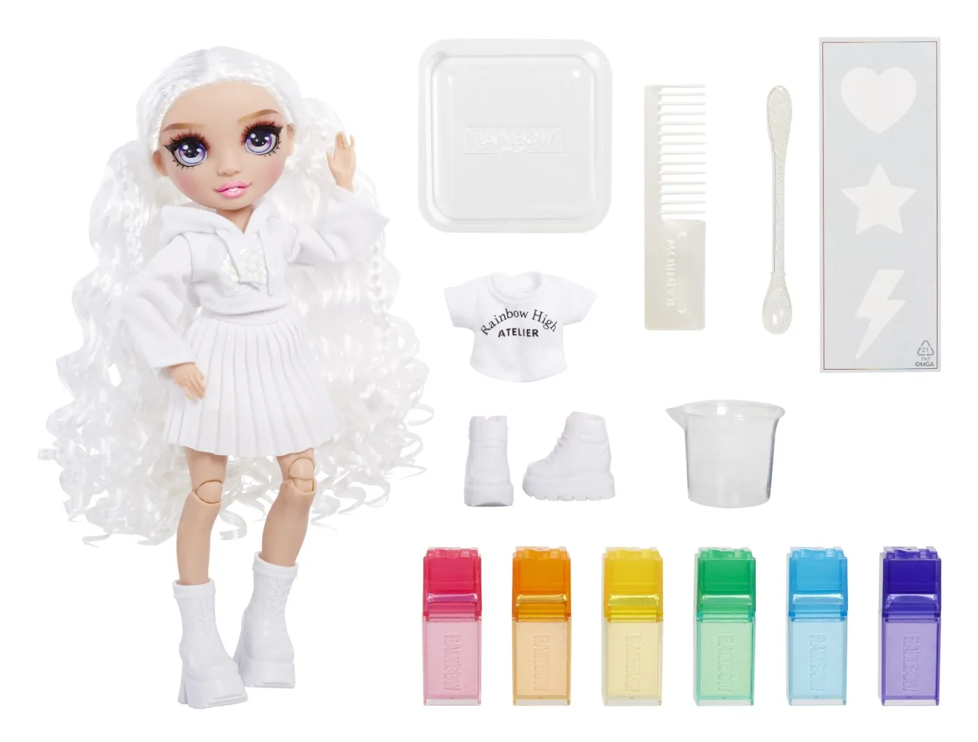 Rainbow High Watercolor & Create face extrem de usor sa-ti creezi propria papusa personalizata Rainbow High in multe moduri diferite, inclusiv cu Tie-Dye! Poti folosi acuarelele lavabile si pe propriul par! Apoi, doar clateste si repeta pentru a crea din nou.Adauga apa in cele 6 pulberi colorate pentru a crea acuarele, apoi coloreaza hainele si parul. Include 6 culori (roz, portocaliu, galben, verde, albastru si violet) pentru a face atat de multe desene colorate. Este atat de simplu!Pentru desene precise, aplica acuarelele folosind buretele cu doua capete direct pe haine si par. Atatea moduri de a te distra!Include elastice pentru a crea modele amuzante de tie-dye – spirale, straturi si multe altele.Sabloanele fac usor sa creezi forme amuzante pe par si haine.In plus, fata de papusa imbracata intr-o tinuta alba (hanorac cu gluga, fusta pliata si pantofi albi), primesti si un tricou si pantofi bonus.Este atat de usor sa repeti procesul. Pur si simplu spala cu apa si sapun, lasa sa se usuce si incepe din nou sa creezi!Coloreaza-ti si tu parul! Doar aplica pe suvite pentru a adauga culoare parului tau. Nota culoarea va fi mai vibranta pe parul mai deschis!Papusa Watercolor & Create are par lung si frumos cu bucle si o impletitura in partea de sus, gene lungi si ochi din sticla. Colectioneaza intreaga gama de papusi Watercolor & Create.Este inclusa 1 papusa exclusiva cu o tinuta complet alba si incaltaminte pentru papusa plus tricou si pantofi bonus, 6 acuarele lavabile colorate, burete cu doua capete, elastice, sablon, pahar de masurare, bol de unica folosinta, lingura si pieptene.Fiind complet articulata, este super distractiva si usor de personalizat. Capul, bratele, mainile si picioarele se indoaie pentru multe pozitii amuzante, inclusiv spagatul! O poti expune pe suportul inclus pentru papusa.