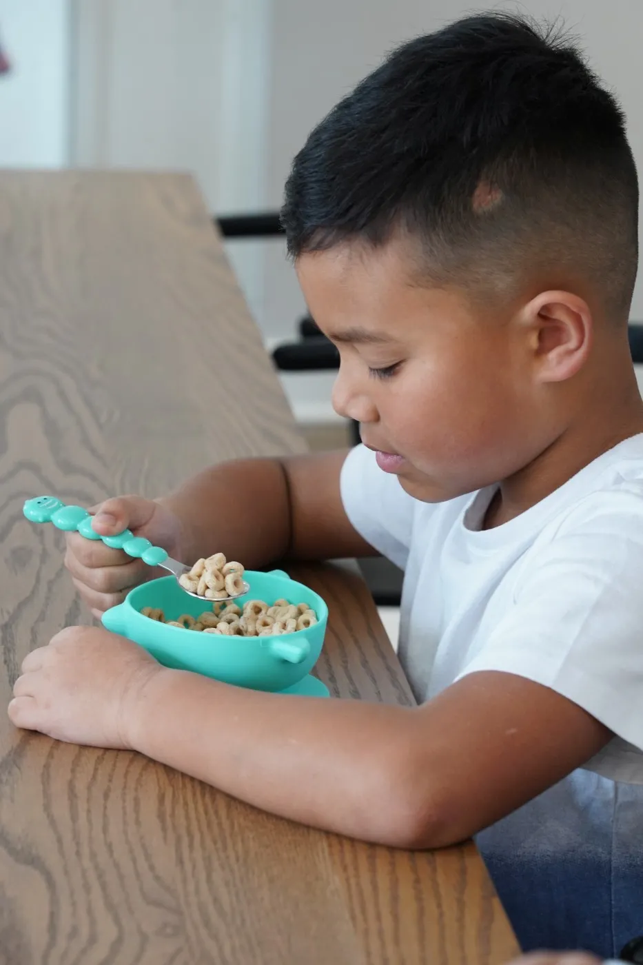 Set 2 boluri silicon cu ventuza, Melii, model rechin Sa fim sinceri, hranirea copiilor nu este o sarcina usoara – este dezordonata! Bolurile noastre cu ventuza din 100% silicon sunt menite sa faca ora mesei mai putin stresanta si mai distractiva. Pur si simplu plaseaza-l pe o suprafata plata si lasa ventuza sa faca magia. Nu mai trebuie sa-ti faci griji ca bolurile vor zbura si ajung rasturnate pe podea! Varietatea de designuri cu animale incurajeaza alimentatia independenta, creand o asociere pozitiva cu ora mesei. Aceasta caracteristica este ideala pentru bebelusi si copii mici, pe masura ce invata sa se hraneasca singuri. Compatibil cu toate tipurile de scaune inalte. Fa din ora mesei o activitate distractiva cu copilul tau! Mai putin stres si FaRa MIZERIE! Colectioneaza toate cele 5 modele dragute de animale. CARACTERISTICI PRODUS Design vesel si prietenos 100% realizate din silicon alimentar, ventuza mare care mentine bolul fixat, capacitate 300ml, include 2 boluri la pachet. Sigure pentru utilizare in cuptorul cu microunde sau congelator sii cel mai important, animalele fac hranirea distractiva! Se pot cuibari si stivui cu usurinta in dulapurile din bucatarie pentru o depozitare compacta. Ajuta la alimentatia independenta Bolurile Melii cu ventuza model rechin sunt 100% din silicon si vor incuraja alimentatia independenta si dezvoltarea abilitatilor motorii fine. Diferitele designuri cu animale ofera o asociere pozitiva cu ora mesei. Bolul ramane pe loc, indiferent cat de tare incearca mancaciosul tau sa il arunce pe podea. Excelent pentru bebelusi si prescolarii care invata sa se hraneasca singuri. Se potriveste cu toate scaunele inalte. Non-toxice Produsele Melii sunt de inalta calitate si nu contin substante chimice nocive fara BPA, fara plumb, fara cadmiu, fara PVC si sunt fabricate din 100% silicon alimentar. Sunt fabricate din silicon moale si durabil, fara margini ascutite. Sunt rezistente si flexibile. Utilizare in masina de spalat vase Curatati temeinic cu detergent si apa calda sau pe raftul superior al masinii de spalat vase inainte de prima utilizare si dupa cum este necesar. Inspectati produsul inainte de fiecare utilizare si aruncati-l la primul semn de deteriorare sau slabiciune.